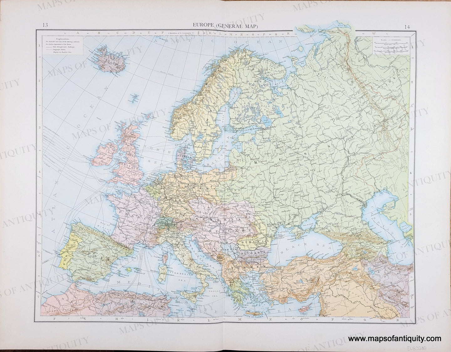 Antique printed color map of Europe. 1900 general map of Europe, as it was at the time. Features the German Empire and Austro-Hungarian empire, as well as European Russia and Turkey. Very good antique condition. Measures approx. 14.5 x 18.75 inches (measured to neatline.)