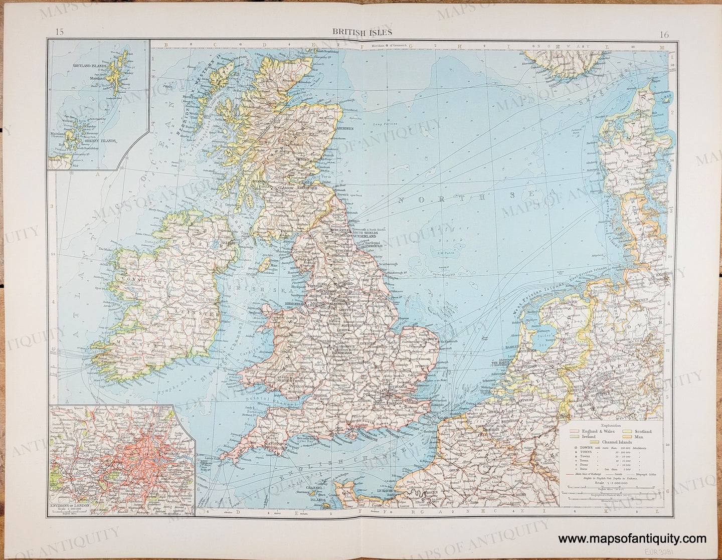 Antique printed color map from 1900, of the British Isles and neighboring coastline. Prominently features England and Wales, Ireland, Isle of Man and Scotland, with inset maps of the Shetland and Orkney Islands, as well as Environs of London. Map key denotes color delineation for countries, main railways, canals, telegraph cables and towns (by size of population.) Very good antique condition, with minimal toning. Measures approx 15.75 x 19.5 inches (measured to neatline.)