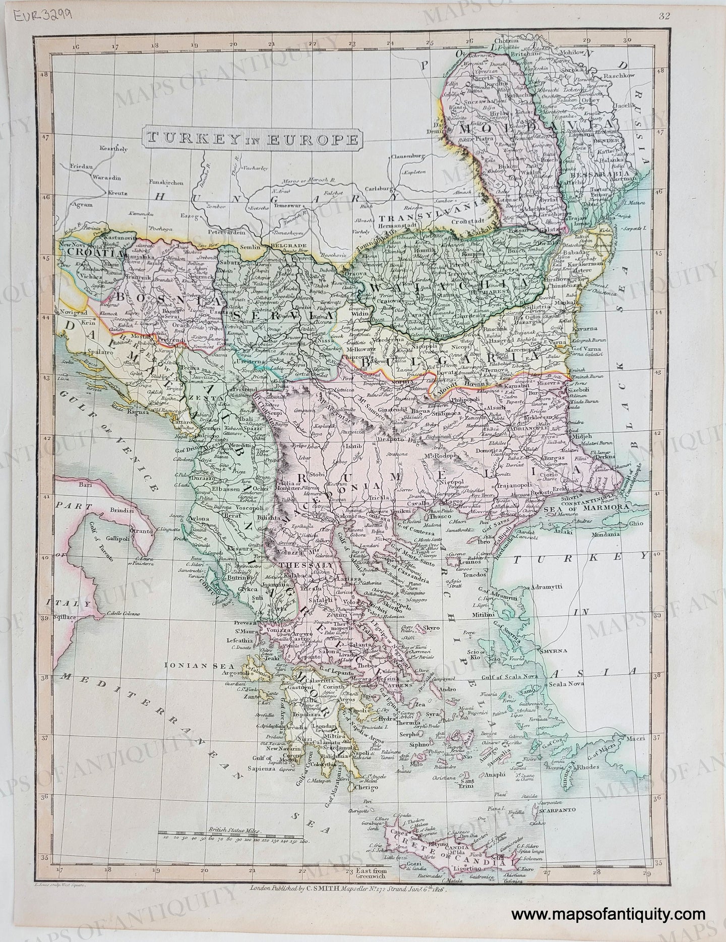 Antique hand-colored map of eastern Europe, published by C. Smith, 1816, during the Second Serbian Uprising of the Serbian Revolution against the Ottoman Empire. Map area encompasses from present-day Croatia to partial Romania in the north to Greece and the island of Crete in the south. Includes some illustrated topographical detail. Very good antique condition with very mild toning of the antique paper and a few areas of minor foxing/soiling at the outer edges. Measures approximately 13.75" x 10.25" to the neatline.
