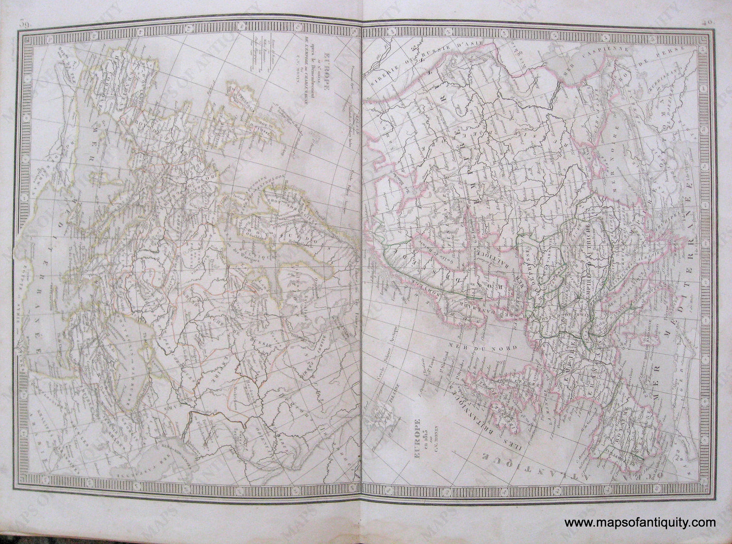 Hand colored outlined antique historical double map from the 1846 issue of atlas Classique de La Geographie Ancienne, du Moyen Age, et Moderne, a L'Usage des Colleges et des Pensiones pour servir a L'Etude de La Geographie et de L'Histoire, corrige et augemnte Par M. Monin, ingenieur-Geographe, membre de la Societe de Geographie.Moyen Age, et Moderne. The Holy Roman Empire began with Charlemagne and ended in 1806. In good antique condition with toning, foxing, discoloration at edges, general signs of age, center fold as issued, ink spots outside neatline. Measures approximately 10.5 x 14 inches.