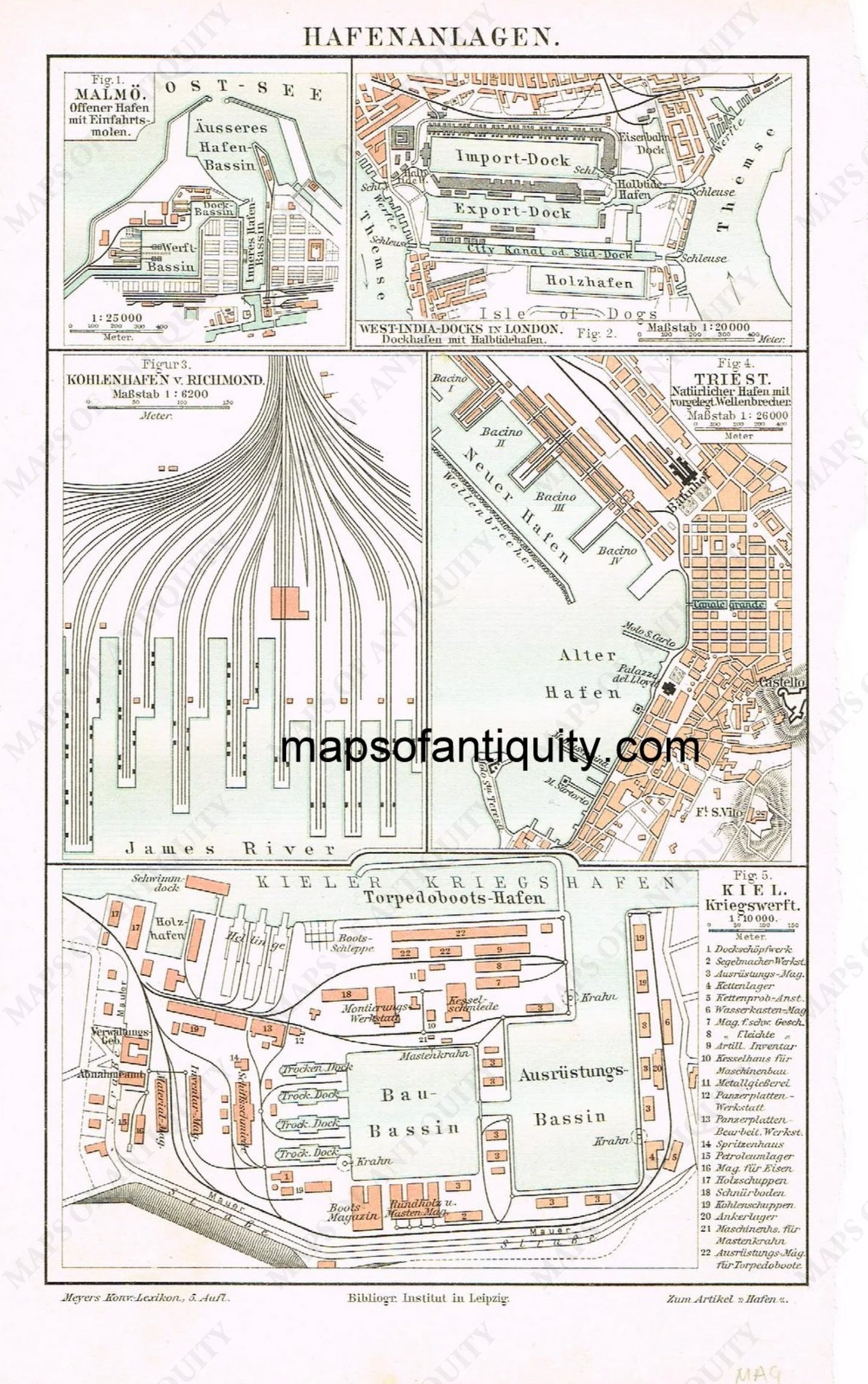 Antique color map of European railroad terminals and docks, including Malmo, Sweden, Trieste, Italy, and the West-India Docks, London, in German. Very good overall antique condition, approx. 8.5 x 5.5 inches.