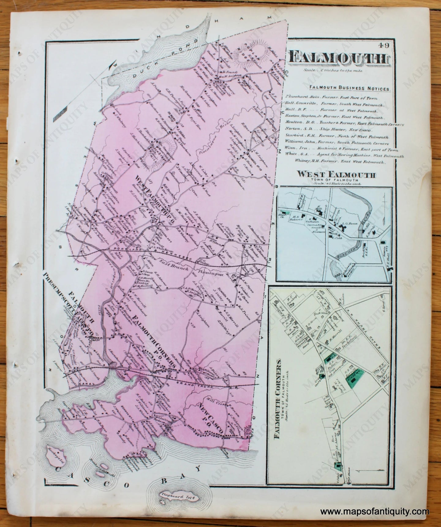 Antique hand colored map of the town of Falmouth, Maine, published in the Atlas of Cumberland Co., Maine, by Beers, 1871. Features business notices and inset maps of West Falmouth and Falmouth Corners. Includes the names of property owners at the time, topographical details, railroads, post offices, etc. Fair to Good overall antique condition with mild toning throughout and some water staining around the edges, continuing into the map. Measures approximately 13.5" x 10.75" (H x W) to the neatline.