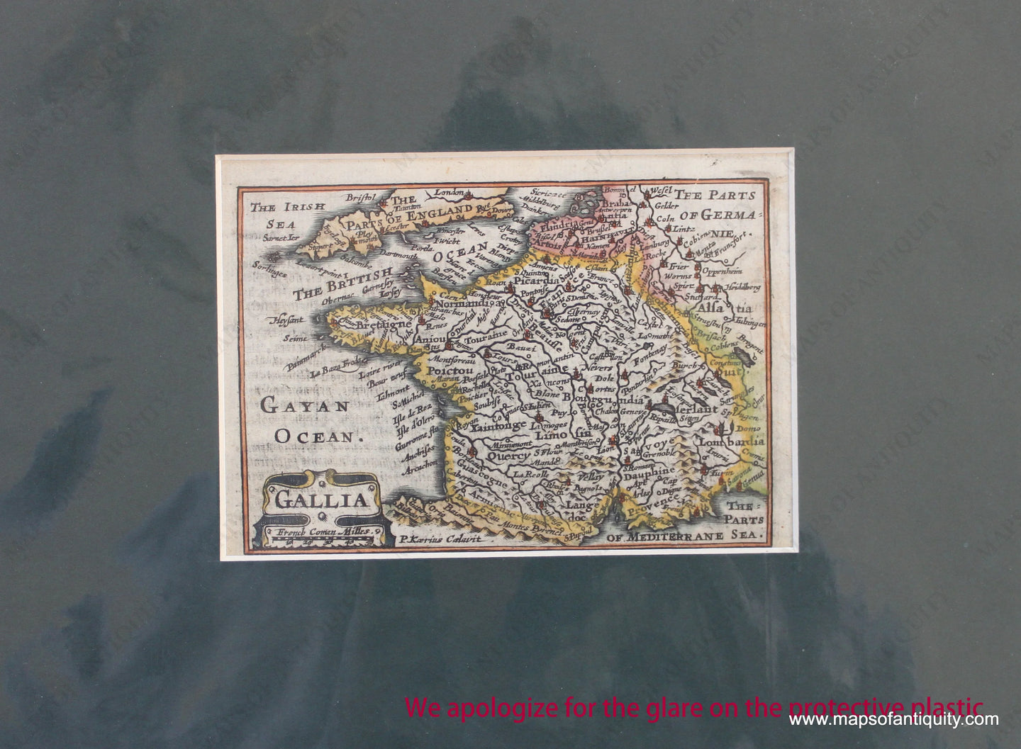 Matted antique hand colored map of France, published by Van der Keere in a miniature pocket atlas of Speed's "A Prospect of the Most Famous Parts of the World," c. 1665. Map includes illustrated topographical detail. Visible plate mark. Good to very good overall antique condition with some toning and roughing of the antique paper, as well as some minor image overlay. Map measures approximately 3.5" x 5" (H x W) to the neatline. Matted with a dark green mat, to measure approx. 10.75" x 12.25" overall.