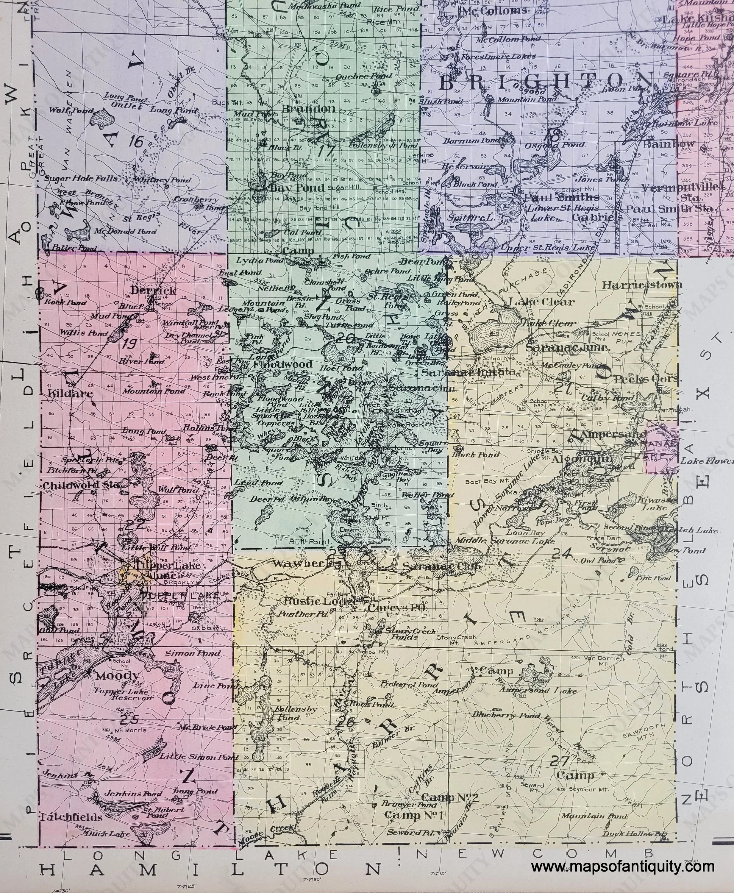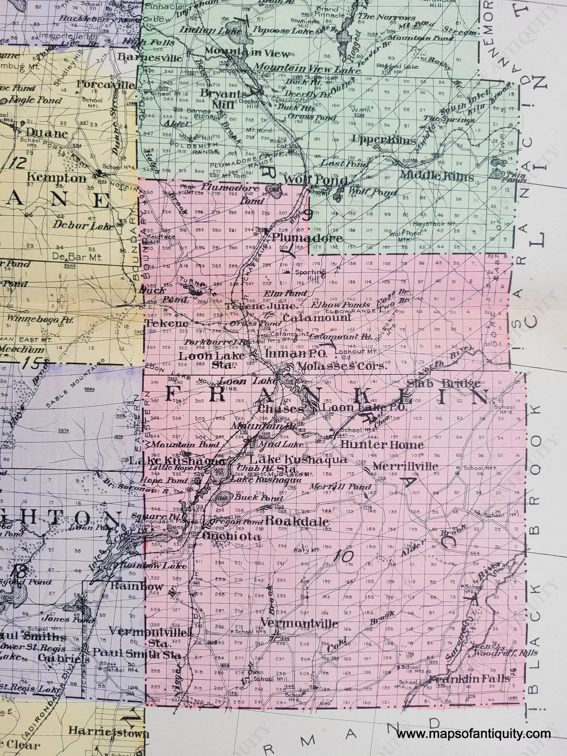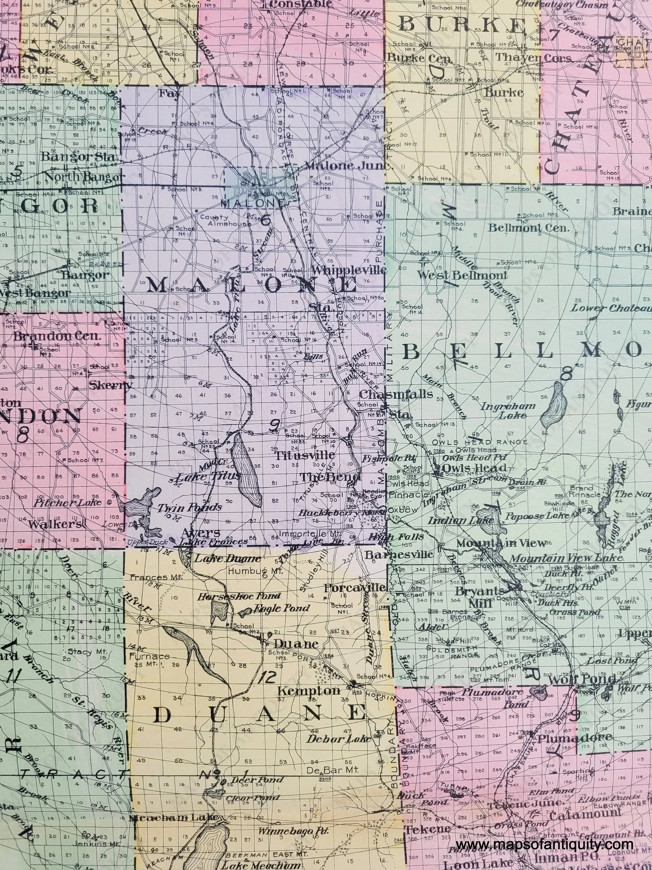 From the New Century Atlas of Counties of the State of New York, 1911, by Everts Publishing Co., showing Franklin County highways, railroads, school houses, and elevation; Very Good condition with some negligable discoloration; size 24 x 30 inches; including the towns of Altamont, Harritstown, Santa Clara, Brighton, Franklin, Waverly, Dickinson, Duane, Bellmont, Malone, Brandon, Moira, Bangor, Chateauga, Burke, Constable, Westville, Bombay, and Fort Covington.