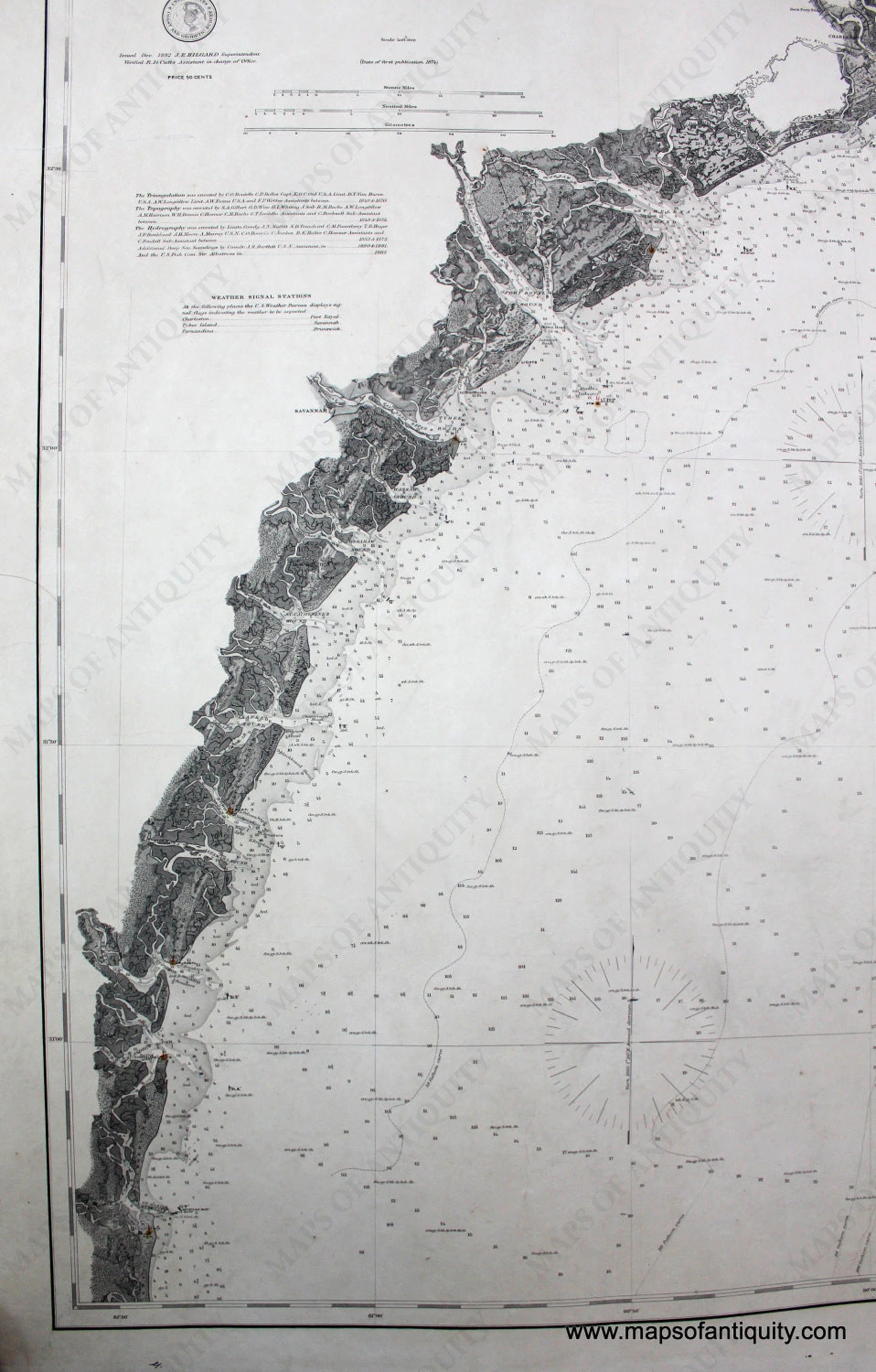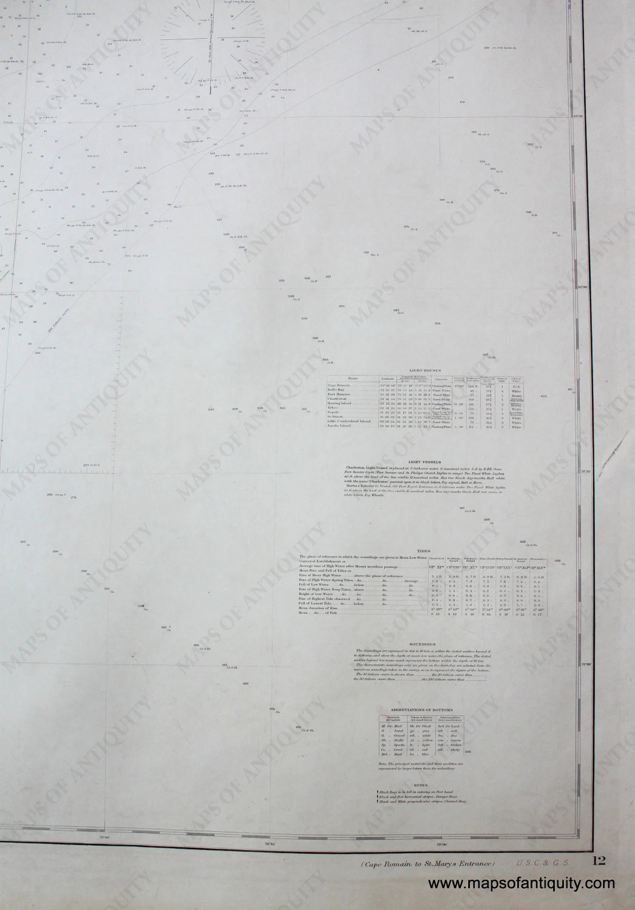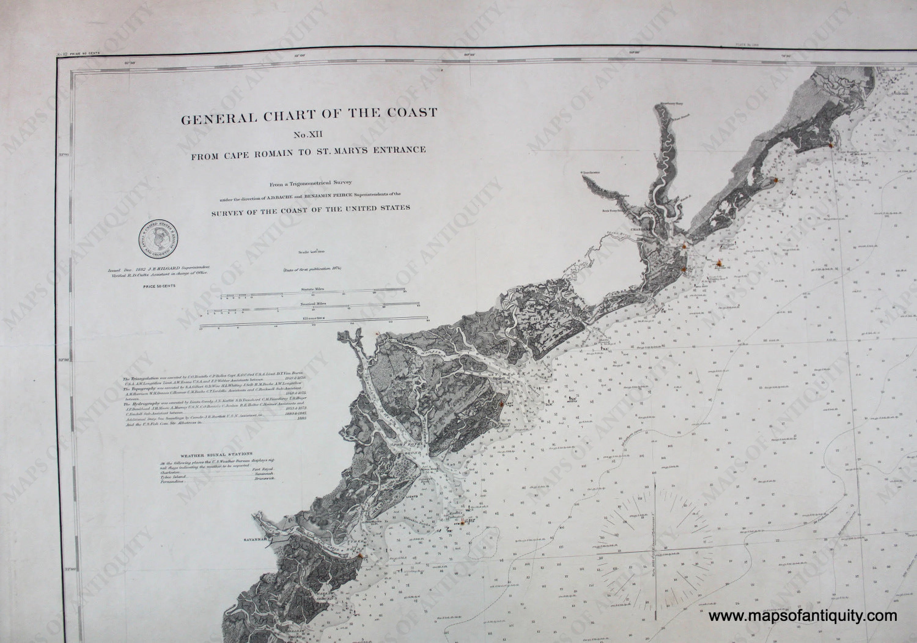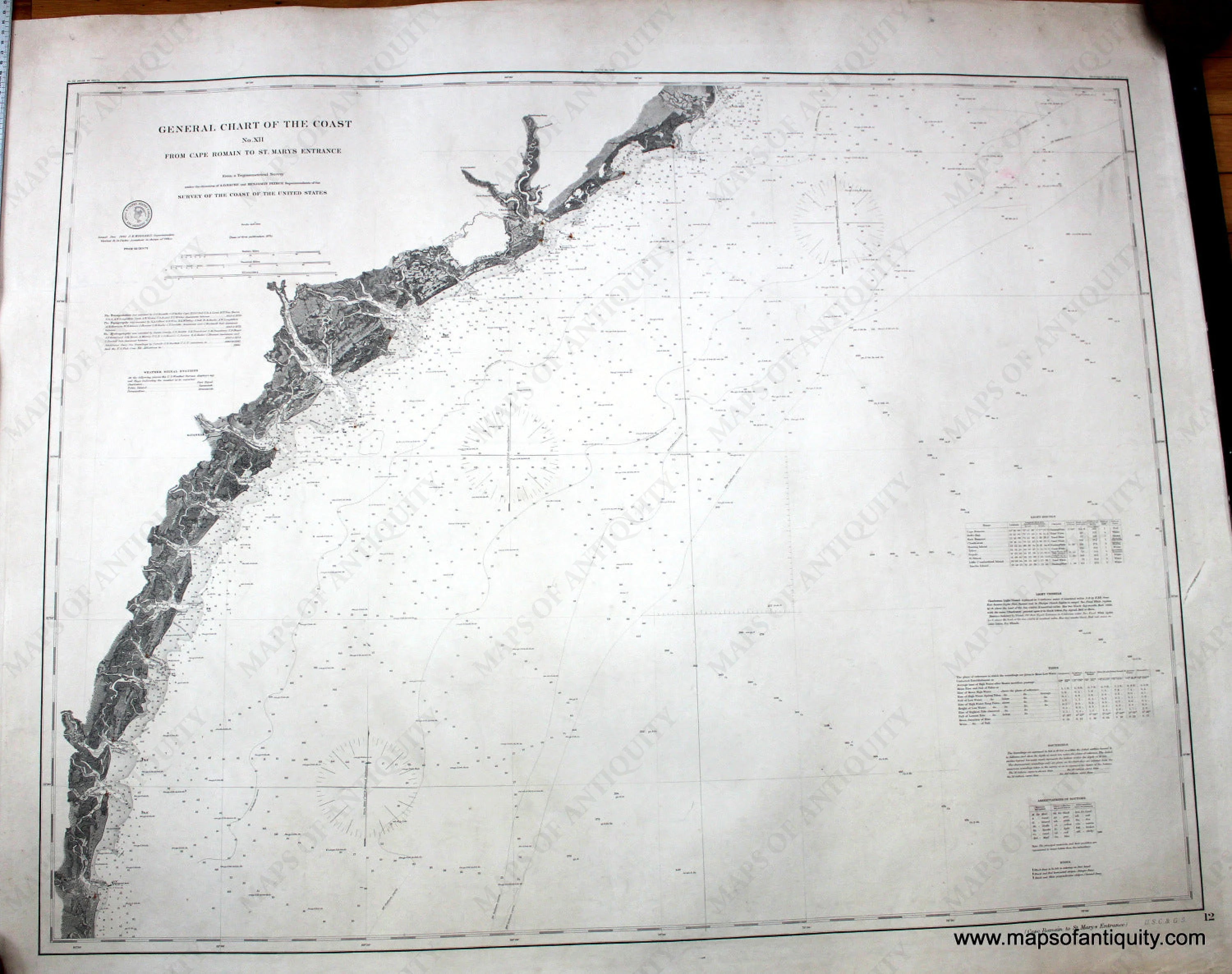 Antique nautical chart - General Chart of the Coast, No. XII, From Cape Romain to St. Marys Entrance, 1882, updated to 1885, includes Hilton Head, Cumberland, Sapello, St. Catherines, St. Simon, St. Jekyll Island, Savannah, and Charleston. Traditional coloring includes lighthouses in yellow and red. Very good overall antique condition with dark clear imprint, about 29 1/2 x 38 inches. This chart has been archivally restored- cleaned, deacidified, and backed. **NOTE- because this map requires extra insurance for shipping, an additional charge will appear on your card after your original purchase. If you would like to know what that charge will be, please contact us.**