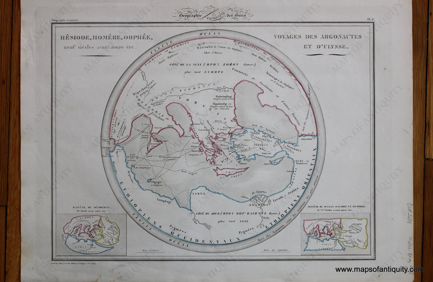 Antique hand colored map of the voyages described in Greek literature. Written in French. Good condition with some slight overall toning, a few brown spots, and some very mild fraying at the edges. By Malte-Brun, in the Atlas Du Precis De La Geographie Universelle, 1846. Approximately 12.25" x 9"