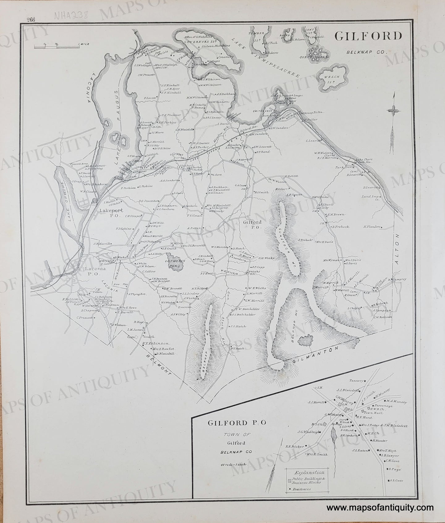 Antique black and white map of Gilford, New Hampshire, with an inset map of the vicinity of the Gilford Post Office. From the Town and City Atlas of the State of New Hampshire, by D.H. Hurd, 1892. Includes the names of property owners at the time of publication. Very good antique condition with mild toning of the paper, and a couple spots of minor foxing/soiling. Measures approx. 13 x 17.25 inches.