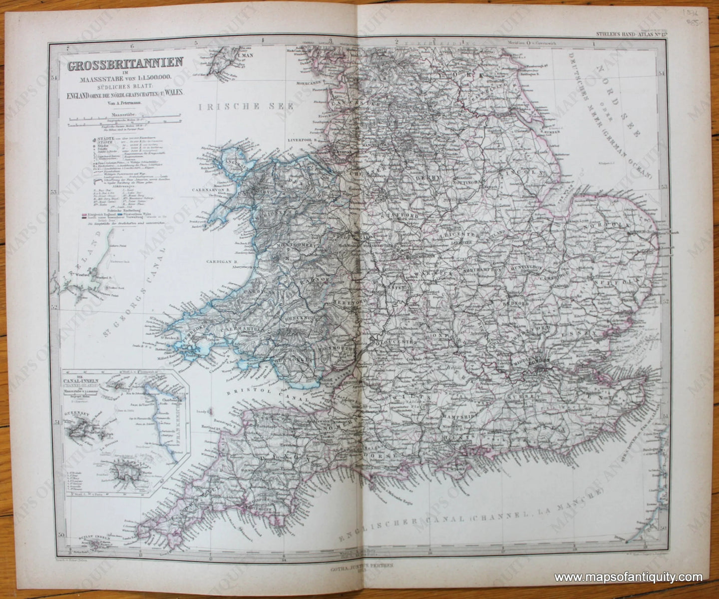 Antique hand colored map of England and Wales from Stieler's Hand-Atlas, c. 1876. With inset map of the Channel Islands. Shows political divisions at that time. Text in German but place names in English. Very good overall antique condition with toning at paper edges. Approx. 13 x 15.75 inches to the neatlines.