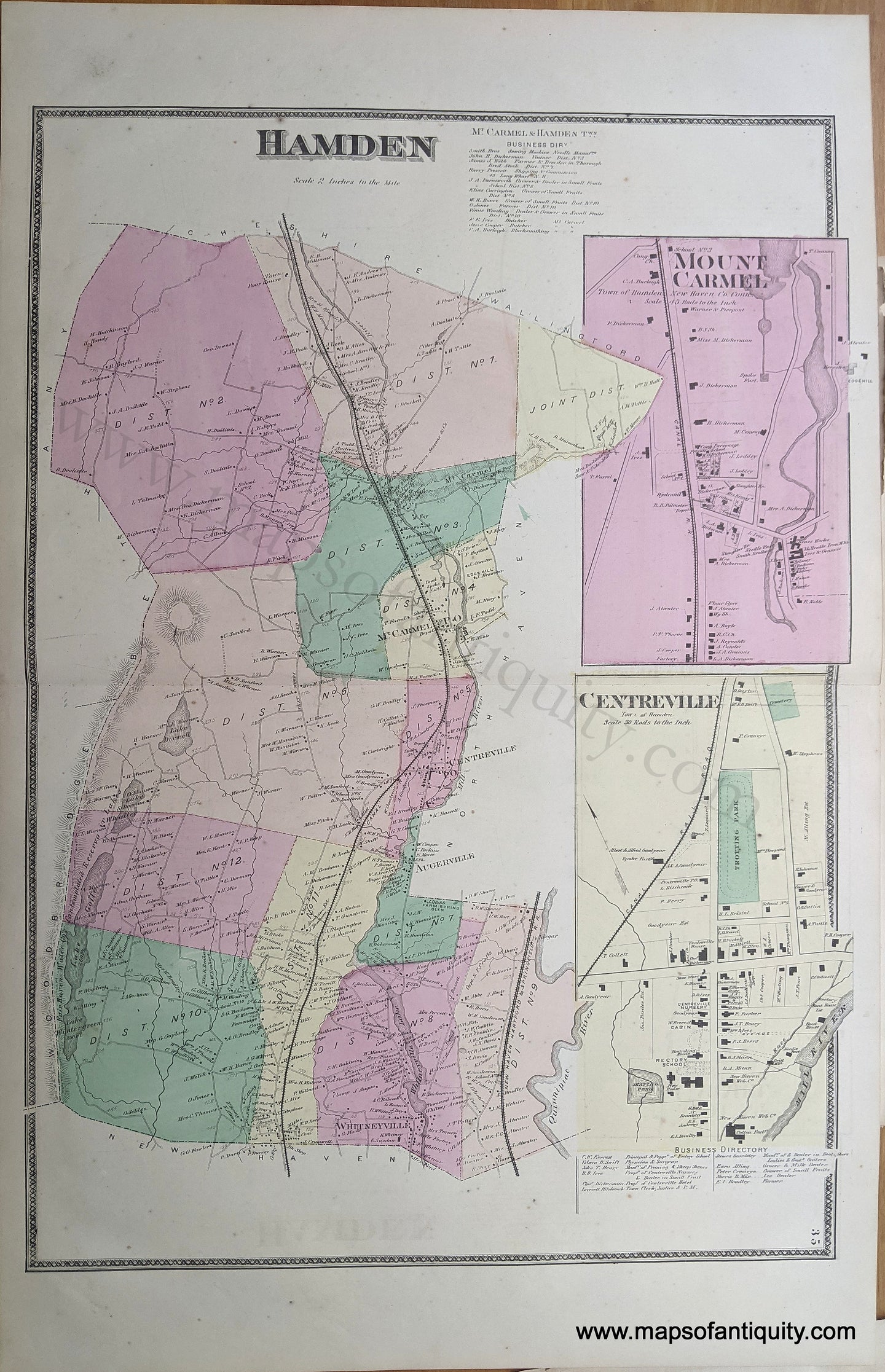 Antique hand-colored map, from F.W. Beers' "County Atlas of New Haven", 1868, map of the Town of Hamden, Connecticut, delineated by districts, showing major roads, railroads, property owners, schools, public buildings, businesses, churches, cemeteries, and topographical details; includes subscribers' business directory and insets of Mount Carmel and Centreville. Fair to good condition with toning, some damage at left side, some minor foxing/spots, measures approx. 21.5 x 15 inches.