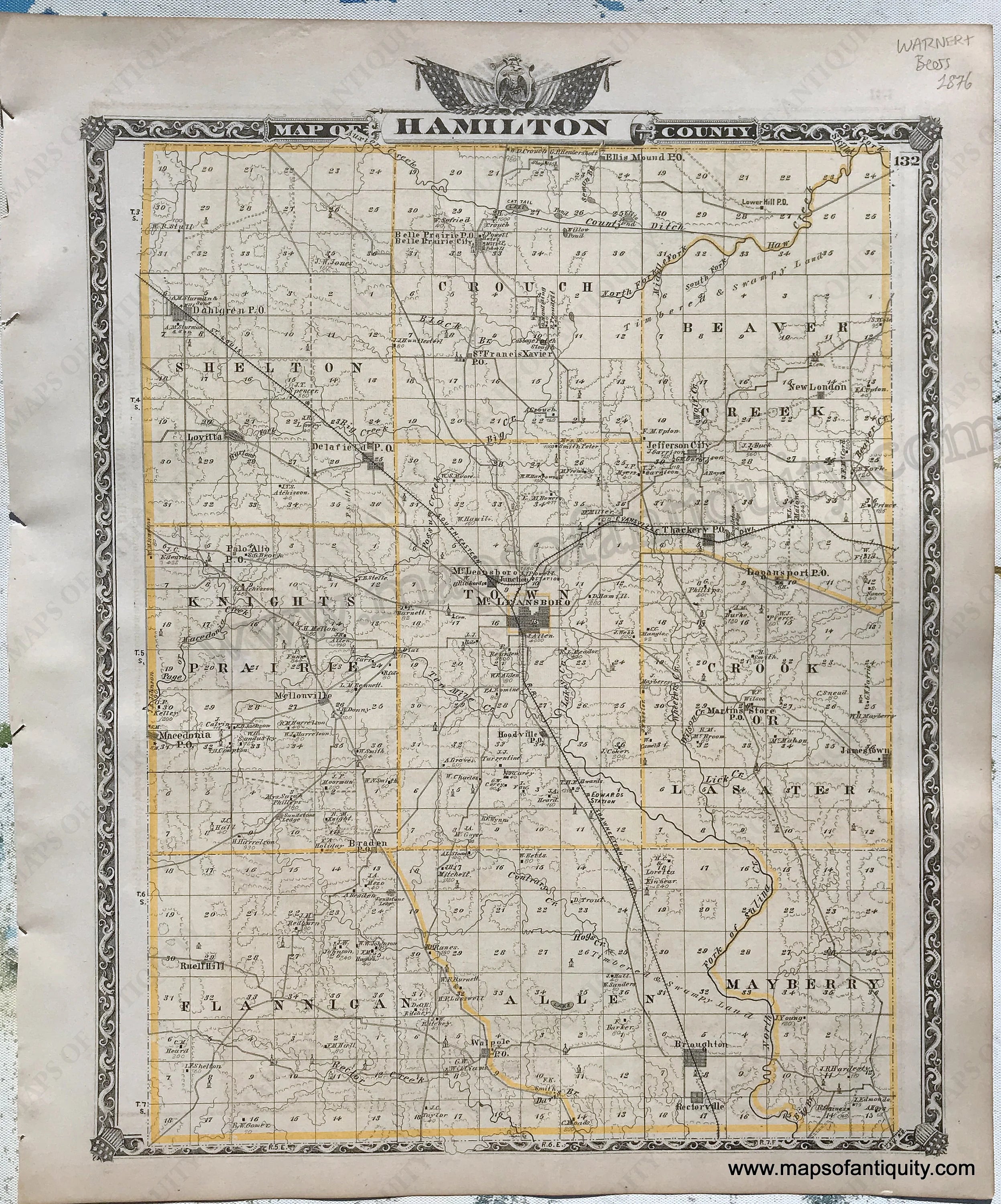 Antique double-sided map: on one side is a map of White County; on the other side is a map of Hamilton County, IL. Published in the Atlas of the State of Illinois, published by Warner & Beers with the Union Atlas Co., 1876. Good to very good condition, with some minor spots and overall mild toning that is a bit darker at the paper edge. Maps measure approx.12.5 x 15.5 inches to the neatline, not including the decorative border.