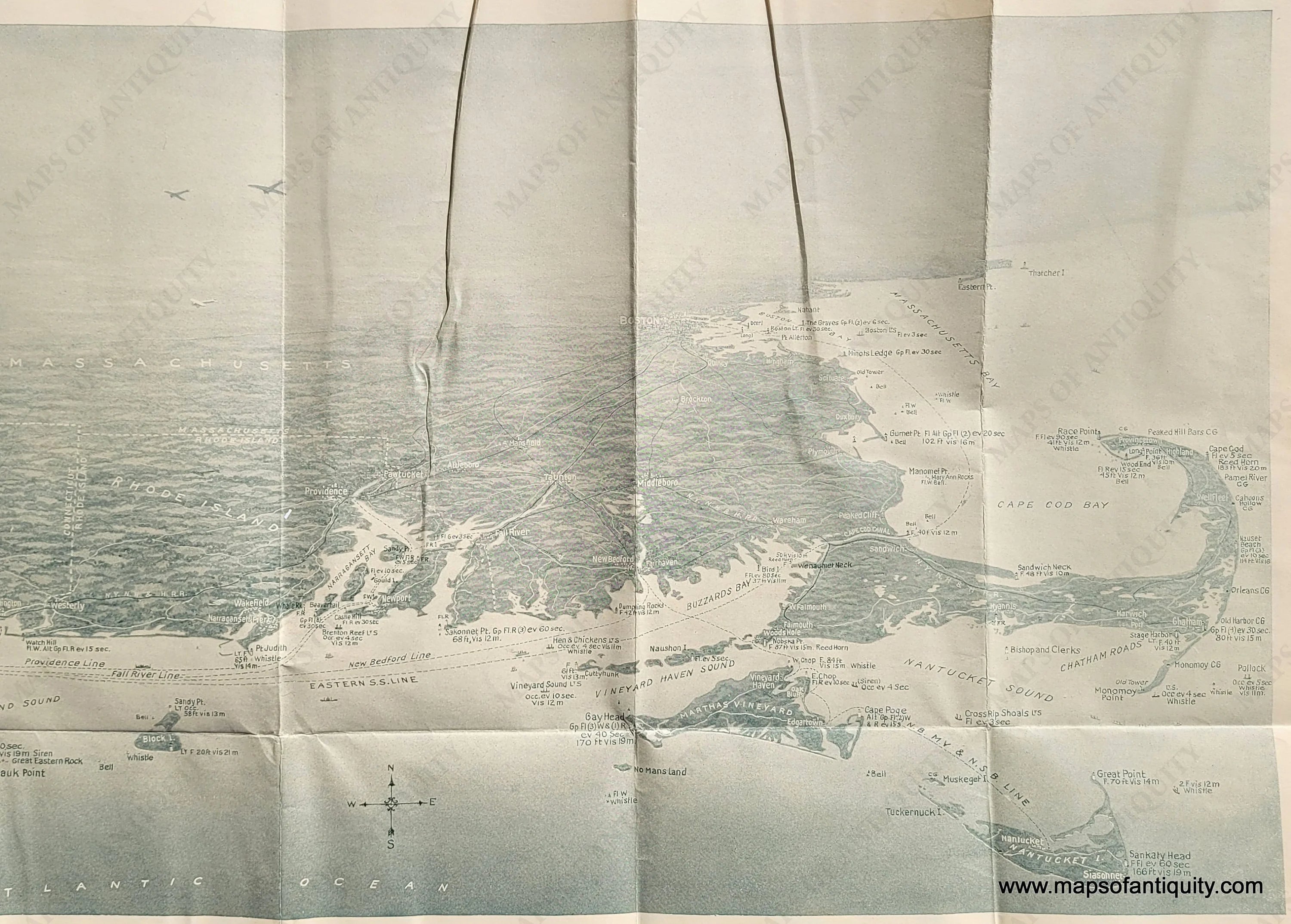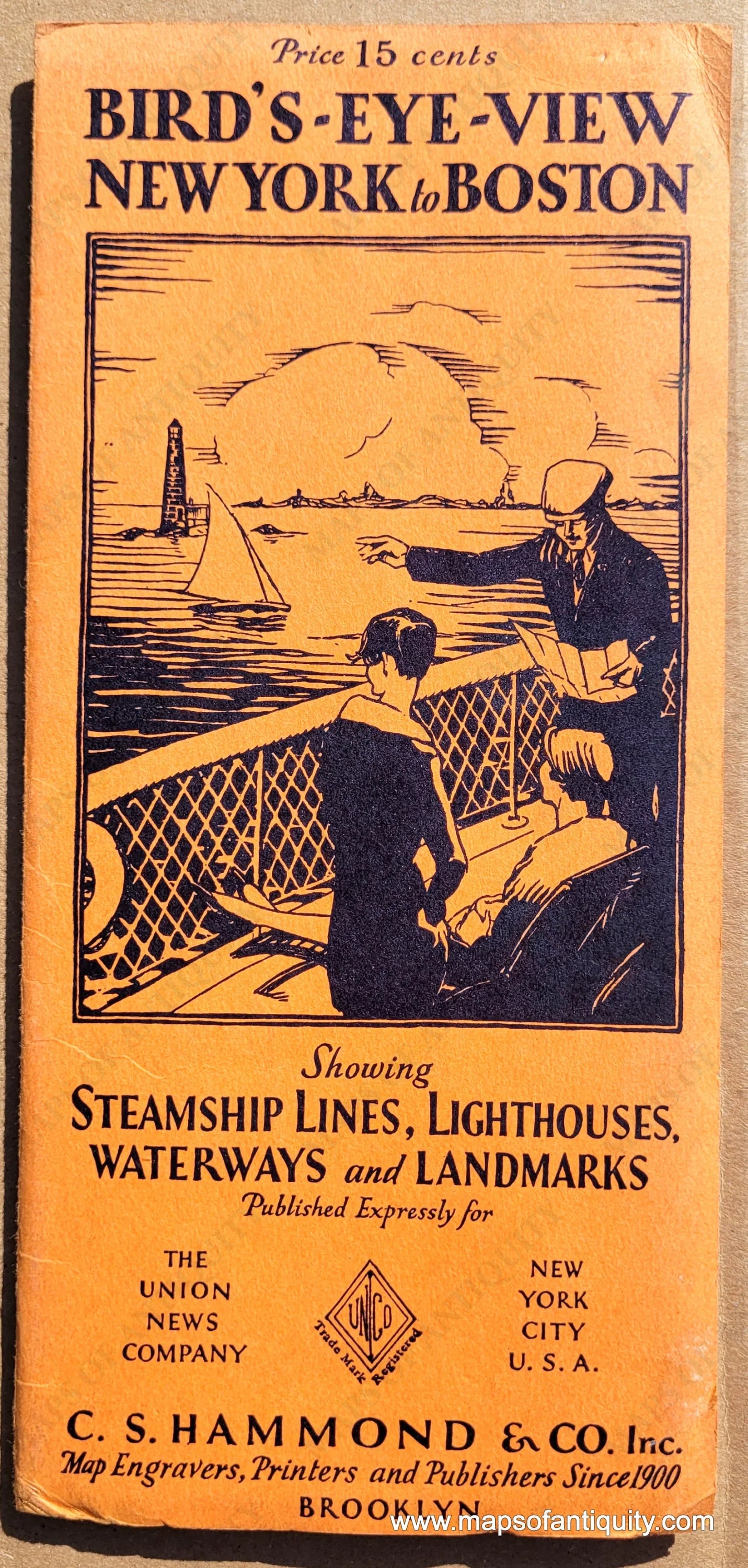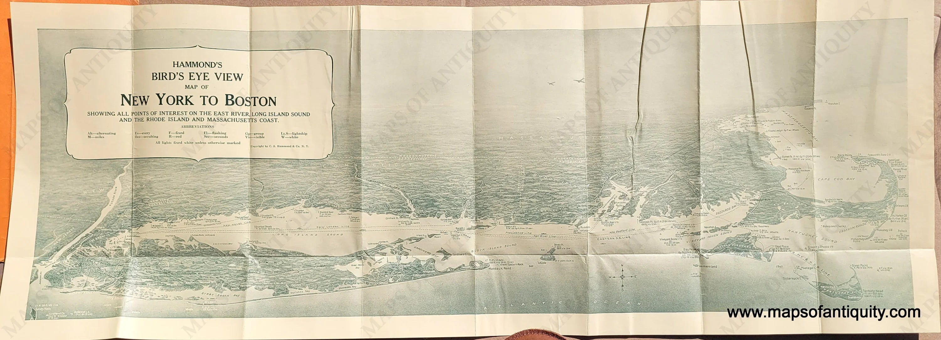 Rare and extraordinary Bird's Eye View Map of New York to Boston, a broad vista showing the Hudson River, Long Island, Manhattan, Connecticut, Rhode Island, and Massachusetts, including Cape Cod, Martha's Vineyard and Nantucket, with lovely detail, showing steamship lines, lighthouses, waterways, landmarks, and noting major points of interest. This map was published during a time of change in the way American traveled: for many years long distance travel was done primarily by boat or train, so this map includes railroads and steamship routes, but with the rising popularity of automobiles, some major roads are included in white. Folding map, good antique condition, with two wrinkles at the top, mild overall toning. We will be trying to smooth the wrinkles with time. Measures approx. 9.25 x 27.75 inches to the edge of the image or 10.75 x 29.25 inches to the paper edges unfolded.