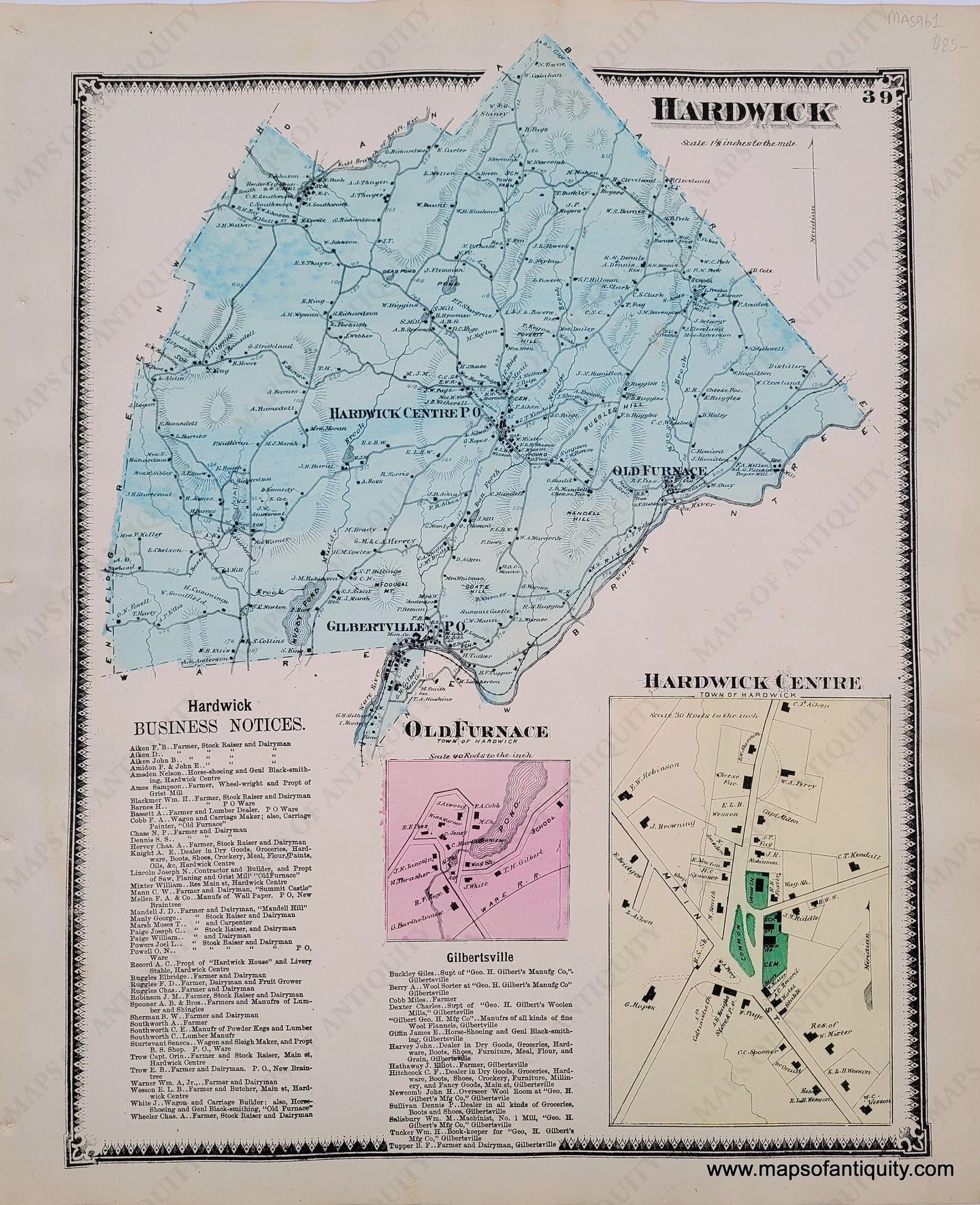 Antique hand-colored map from the Atlas of Worcester County, Massachusetts, by Beers, 1870. Includes property owners' names. Good to very good overall antique condition, paper is lightly toned, some small stains and slight paper loss at left in margin. Measures approx. 14.25 x 11.25 inches.