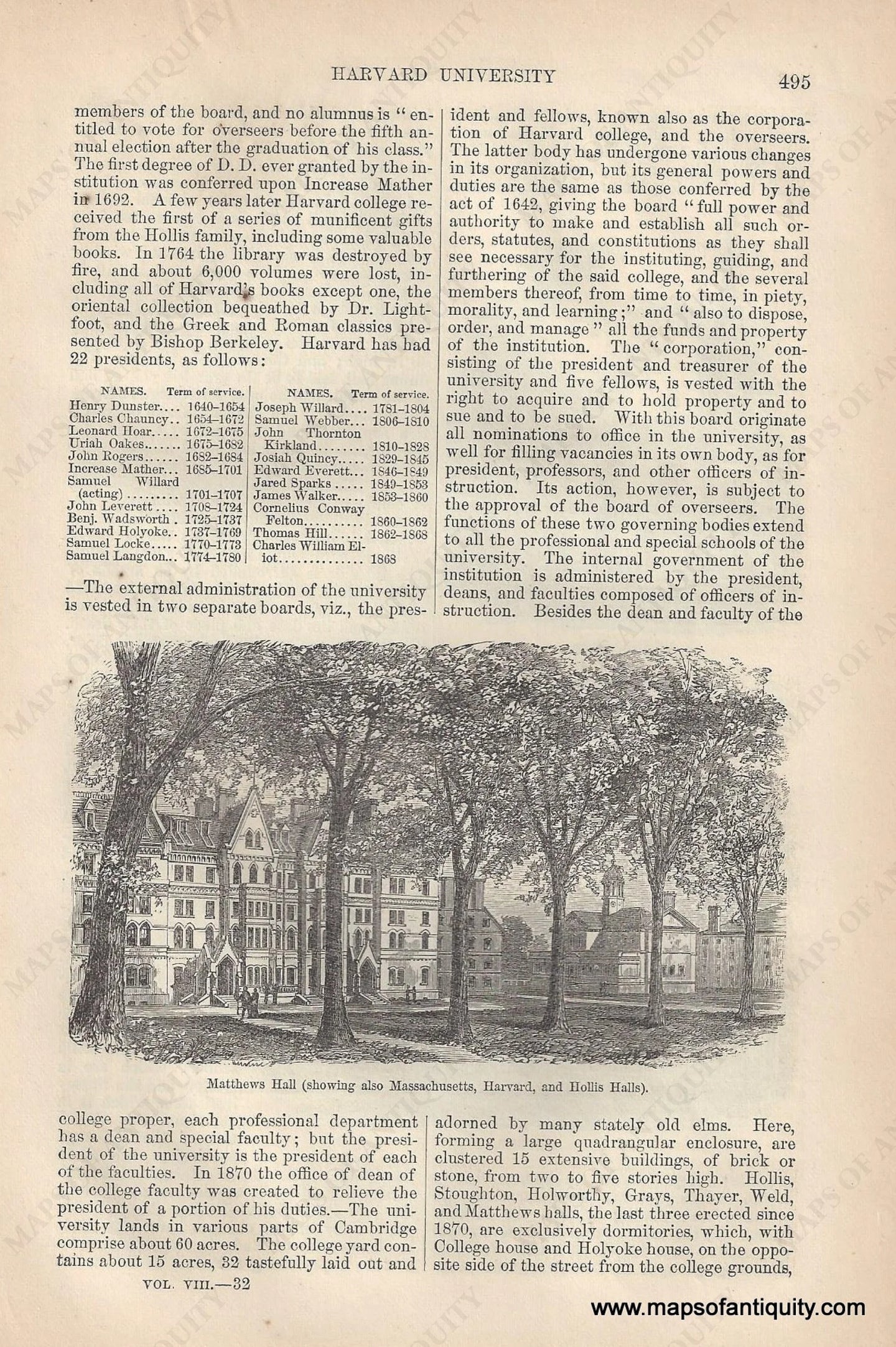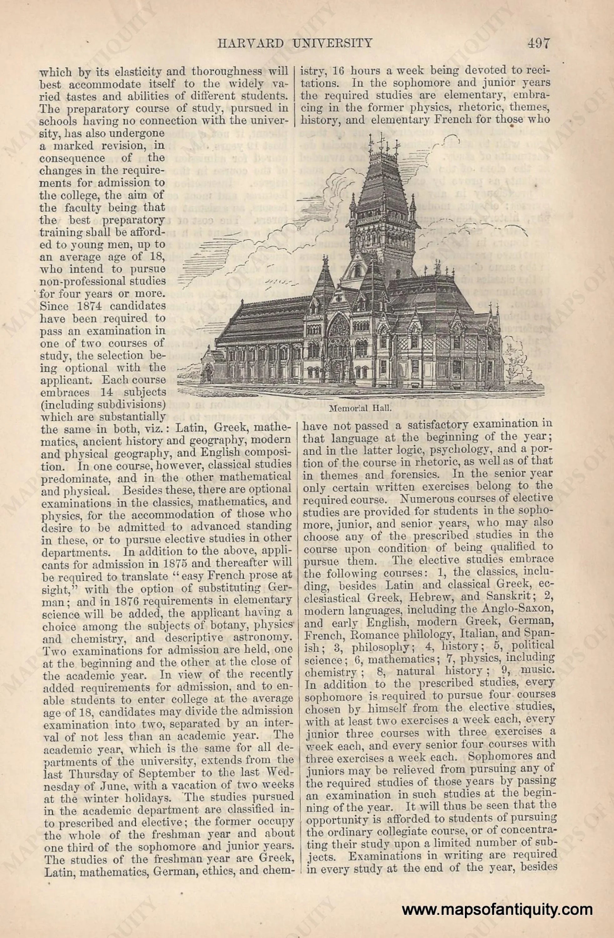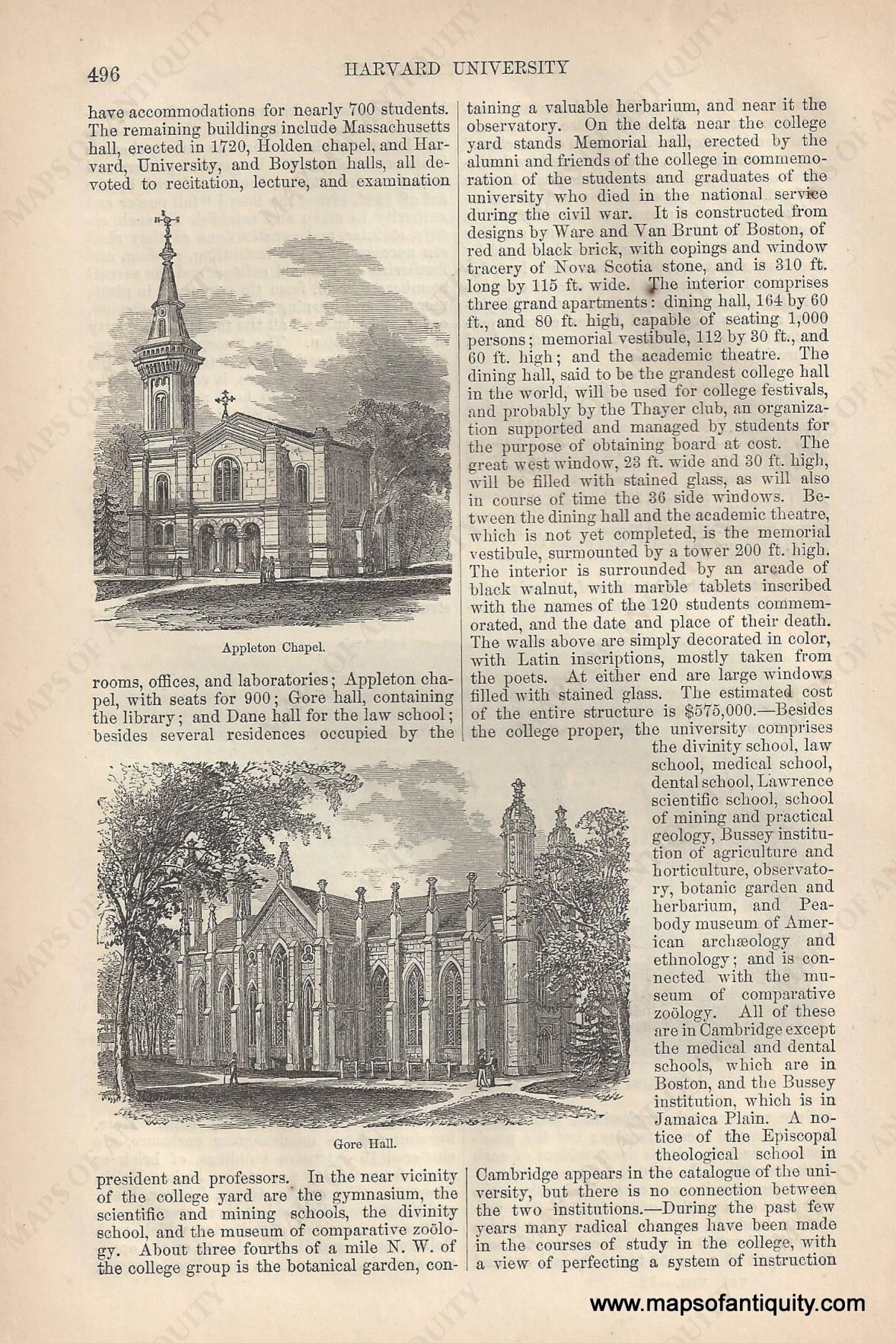 Antique black and white encyclopedia pages featuring text and images of Harvard buildings and areas. Includes Matthews, Massachusetts, Harvard, and Hollis Halls, Appleton Chapel, Gore Hall, and Memorial Hall. Very good condition with toning at edges. 5 pages. Each page approx. 10 x 6.5 inches and double sided