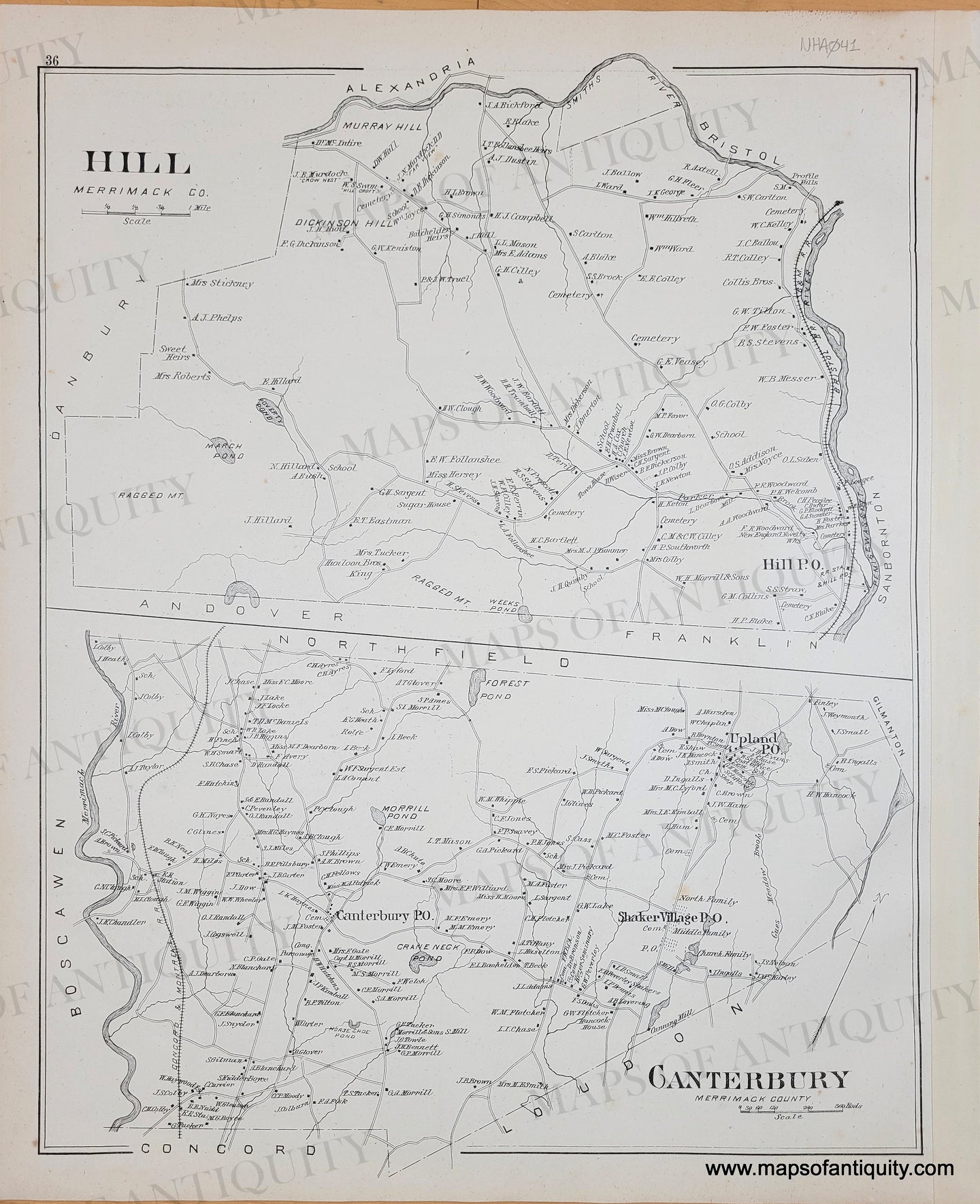 Antique black and white page with maps of Hill, New Hampshire, and Canterbury, New Hampshire. From the Town and City Atlas of the State of New Hampshire, by D.H. Hurd, 1892. Includes the names of property owners at the time of publication. Densely populated areas are enlarged separately. Good antique condition with some toning of the paper, and a couple spots of foxing/soiling. Measures approx. 13 x 17.25 inches.