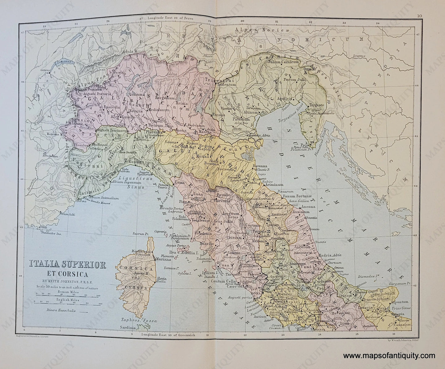Antique printed map by Johnston, published in Ginn & Heath's Classical Atlas c. 1910. This map shows Northern Italy and Corsica in ancient times. Very good antique condition with some minor toning. Page measures approx. 11.5 inches x 13.75 inches. Map measures approx. 9.25 x 12 inches.