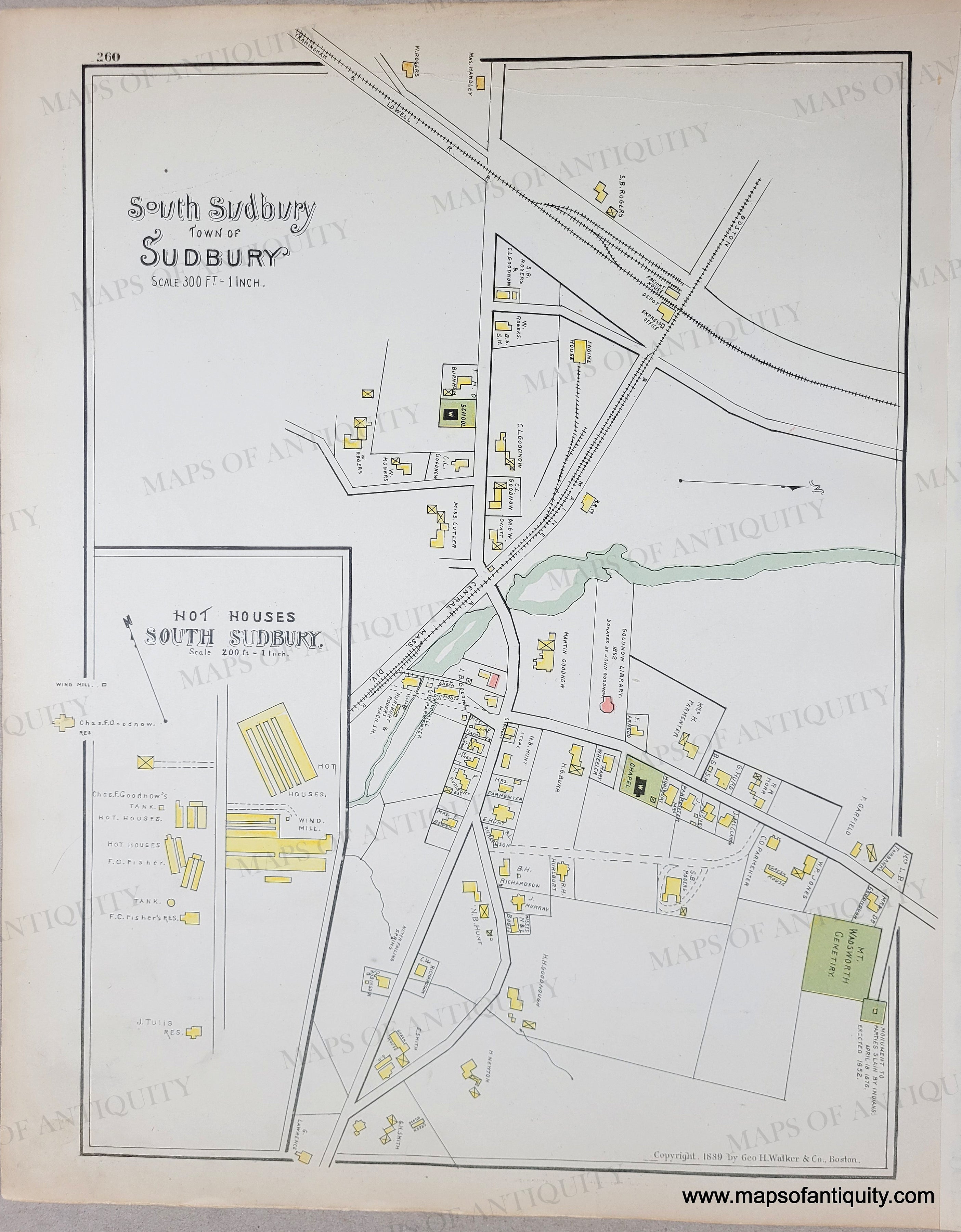 Antique map from the Atlas of Middlesex County, MA, 1889, by Walker. Larger center-fold shows the center of Hudson, Massachusetts, including property owners, named streets, churches, railroad and depot, Mill Pond, Town Hall, etc. Versos display towns of Maynard and Sudbury on one side, and on the other side South Sudbury with inset of South Sudbury hot houses. Good to very good antique condition overall antique condition, with some minor toning mostly at the paper edges. Centerfold measures approx. 16 x 26 inches. Verso maps measure approx. 16 x 12 inches.