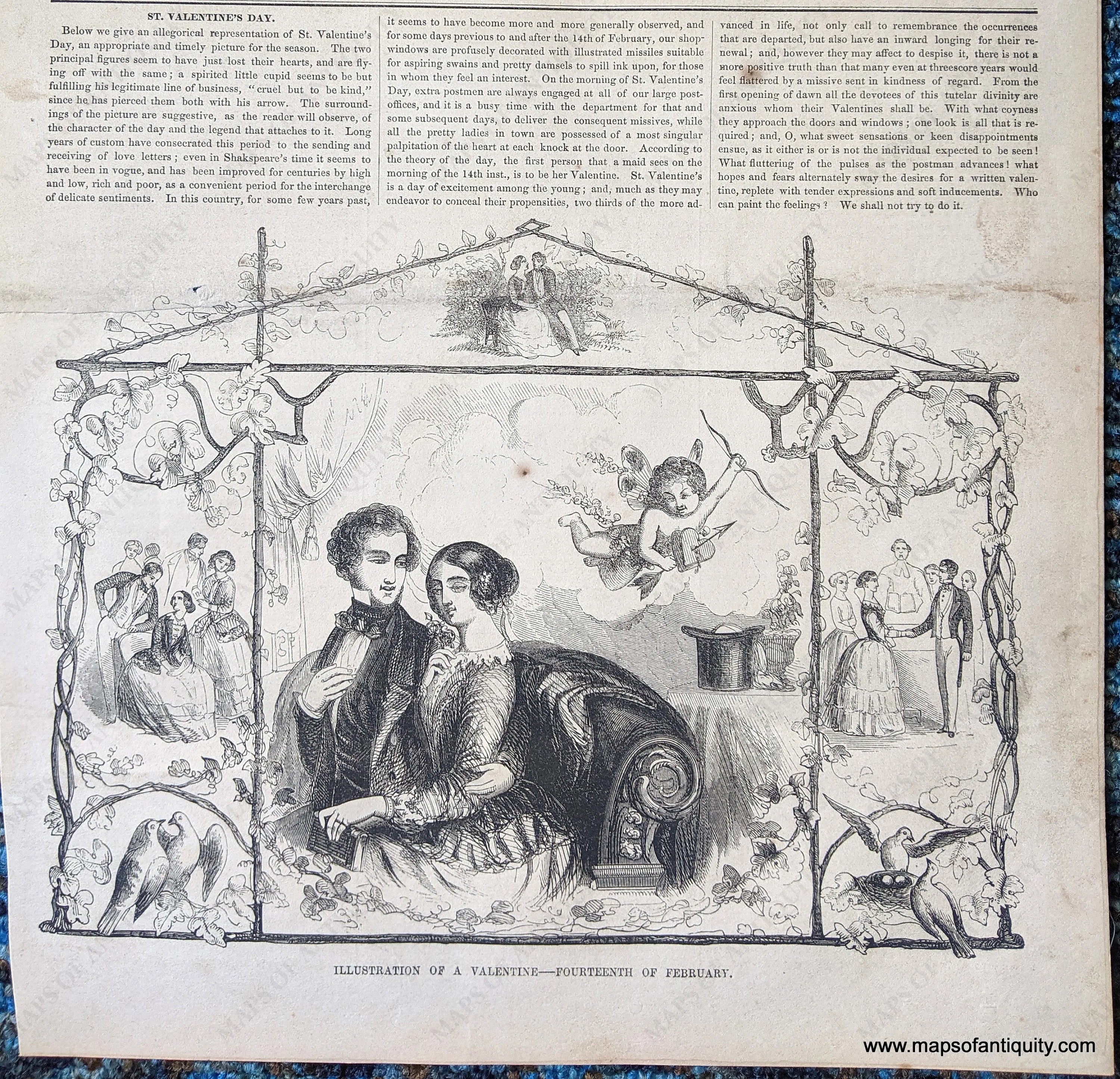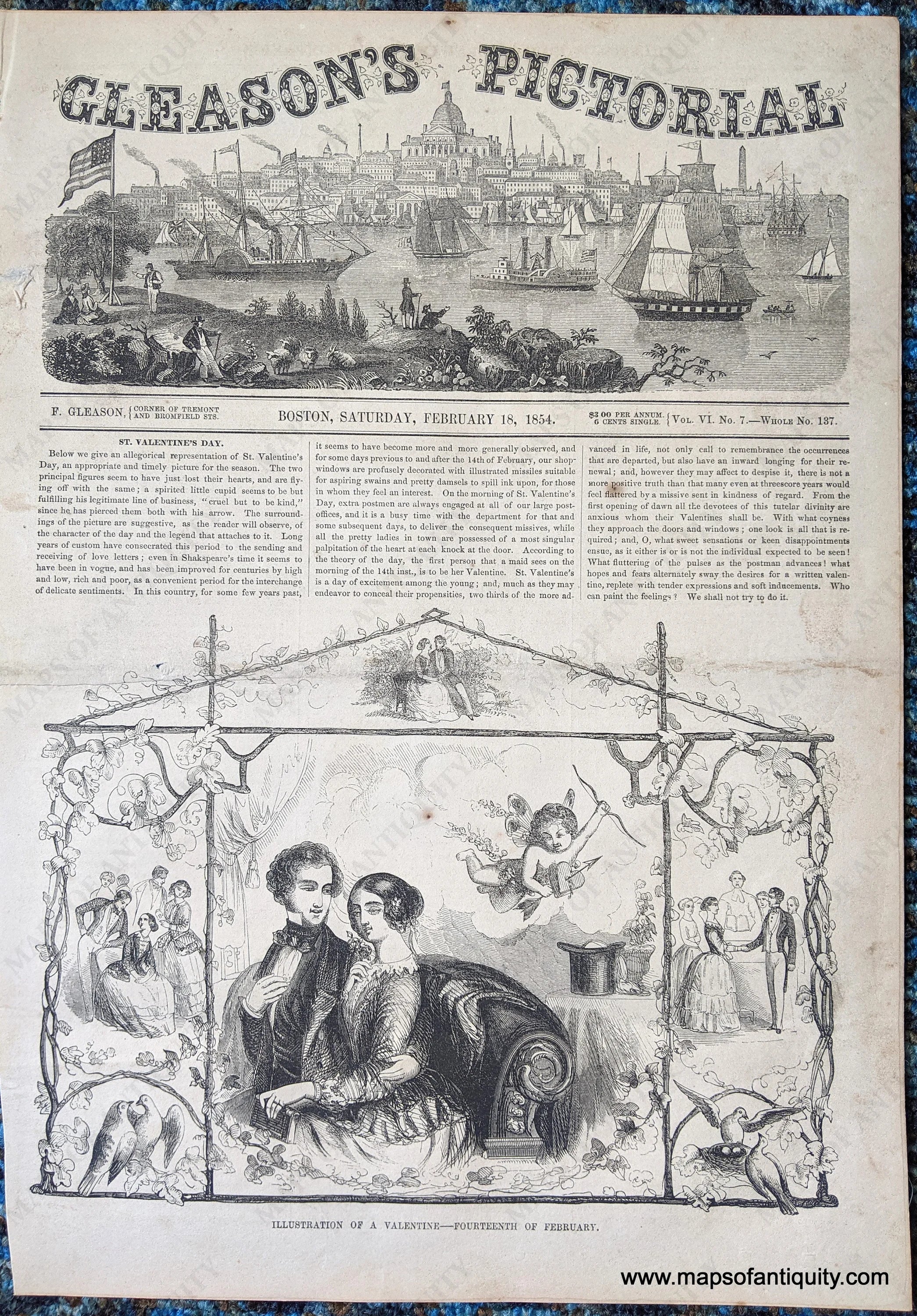Antique print from Gleason's Pictorial, Boston, Saturday, February 18, 1854. Decorative header with a view of Boston. Good condition with some stains. Page measures approx. 15 x 10 inches.