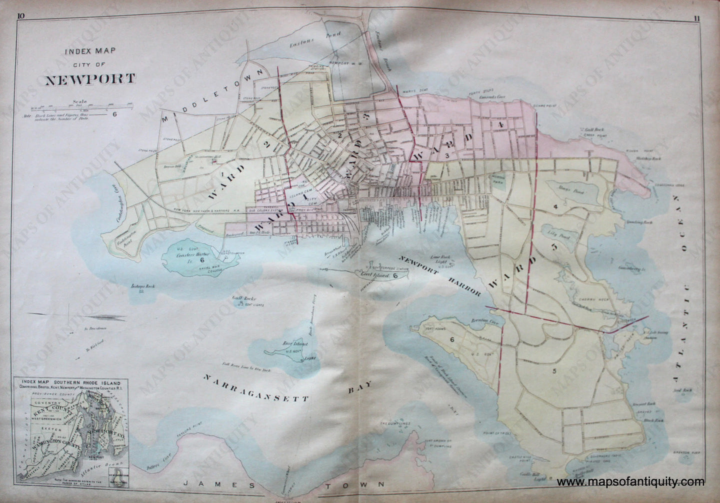Antique hand colored map of Newport, RI, Rhode Island, from Everts & Richards' 1895 Atlas of Southern Rhode Island. Very good antique condition with toning at edges and slight wrinkling at center seam that may be alleviated when framed. approx. 20 x 30.5 inches.