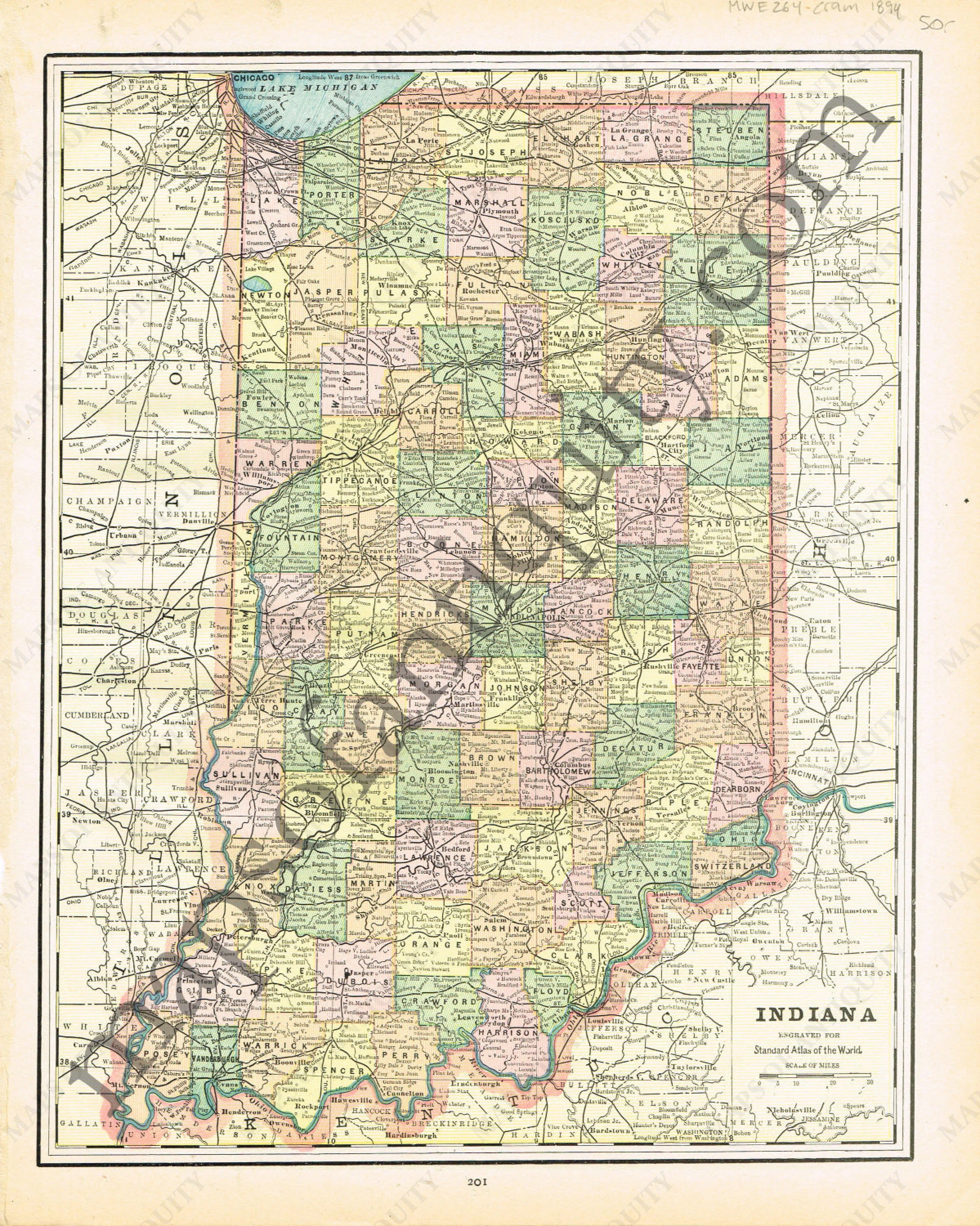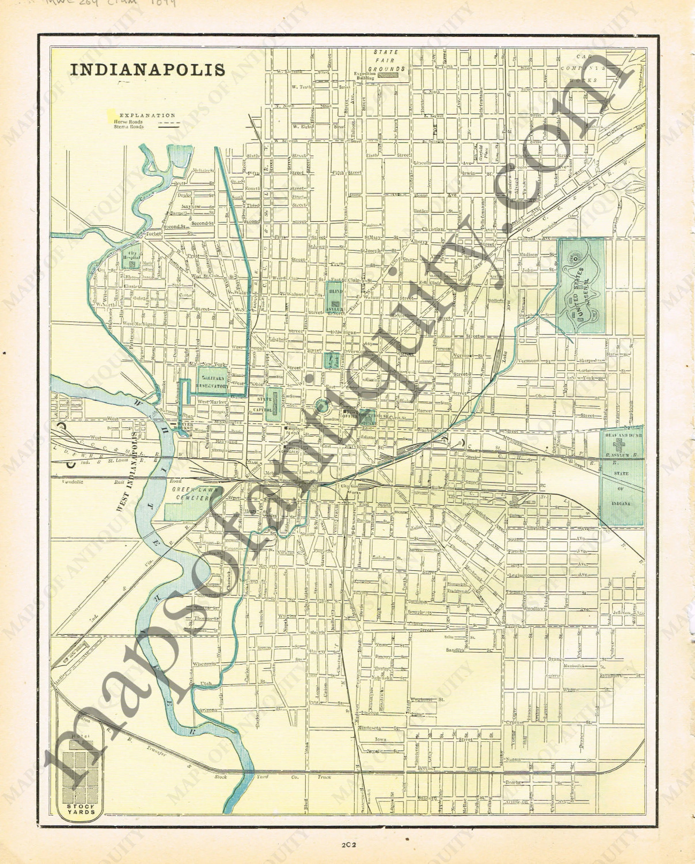 Antique printed color map of Indiana. verso: Indianapolis, Indiana including the United States Arsenal and the White River. Very good condition with some slight toning at the edges. By Cram, in The Standard Atlas and Gazetteer of The World, 1894. Approx. 13" x 10.25" to the neatline.