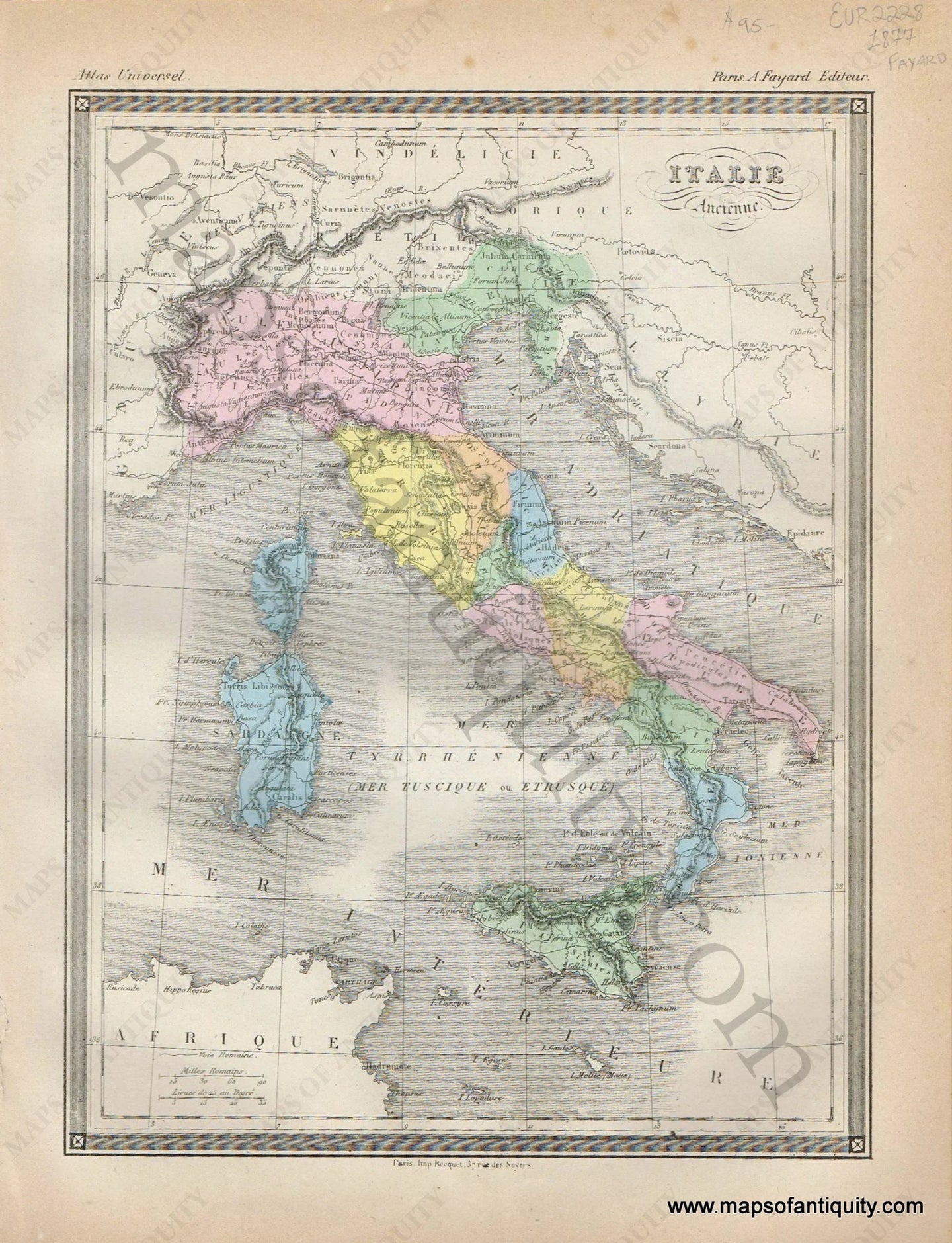 Antique hand colored map of Ancient Italy, published by Fayard in the "Atlas Universel," 1877. Map is written in French and includes general topographical detail. Good to Very good overall antique condition, with toning throughout and some minor foxing. Measures approximately 10" x 7.75" to the neatline.