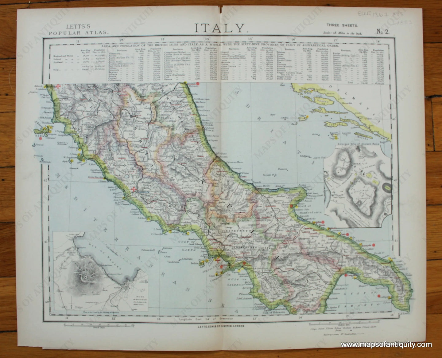 This colored antique map was published in Letts's 1883 Popular Atlas, Being a Series of Maps Delineating the Whole Surface of the Globe, with Many Special and Original Features. This map shows central Italy, including Naples, Umbria, The Marches, and the coast of Dalmatia. Details include area and population of the British Isles and Italy as a whole, with the sixty-nine provinces of Italy, insets of Ancient Rome and a Plan of the Coast in the Vicinity of Vesuvius. Showing major points of interest and geological features, it measures approximately 15.5 x 14 inches and is in good antique condition with some toning and foxing and discoloration and crease at center fold.