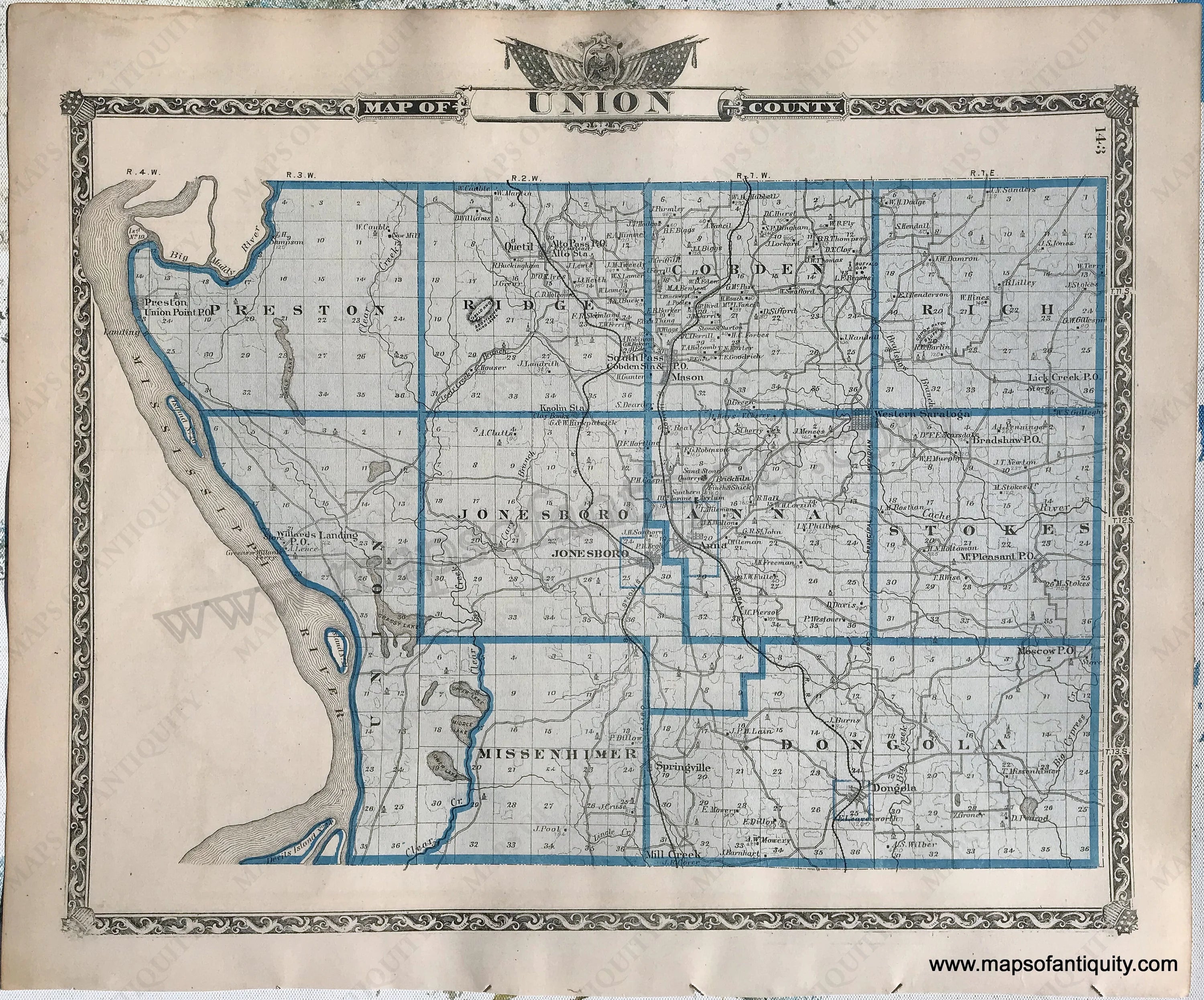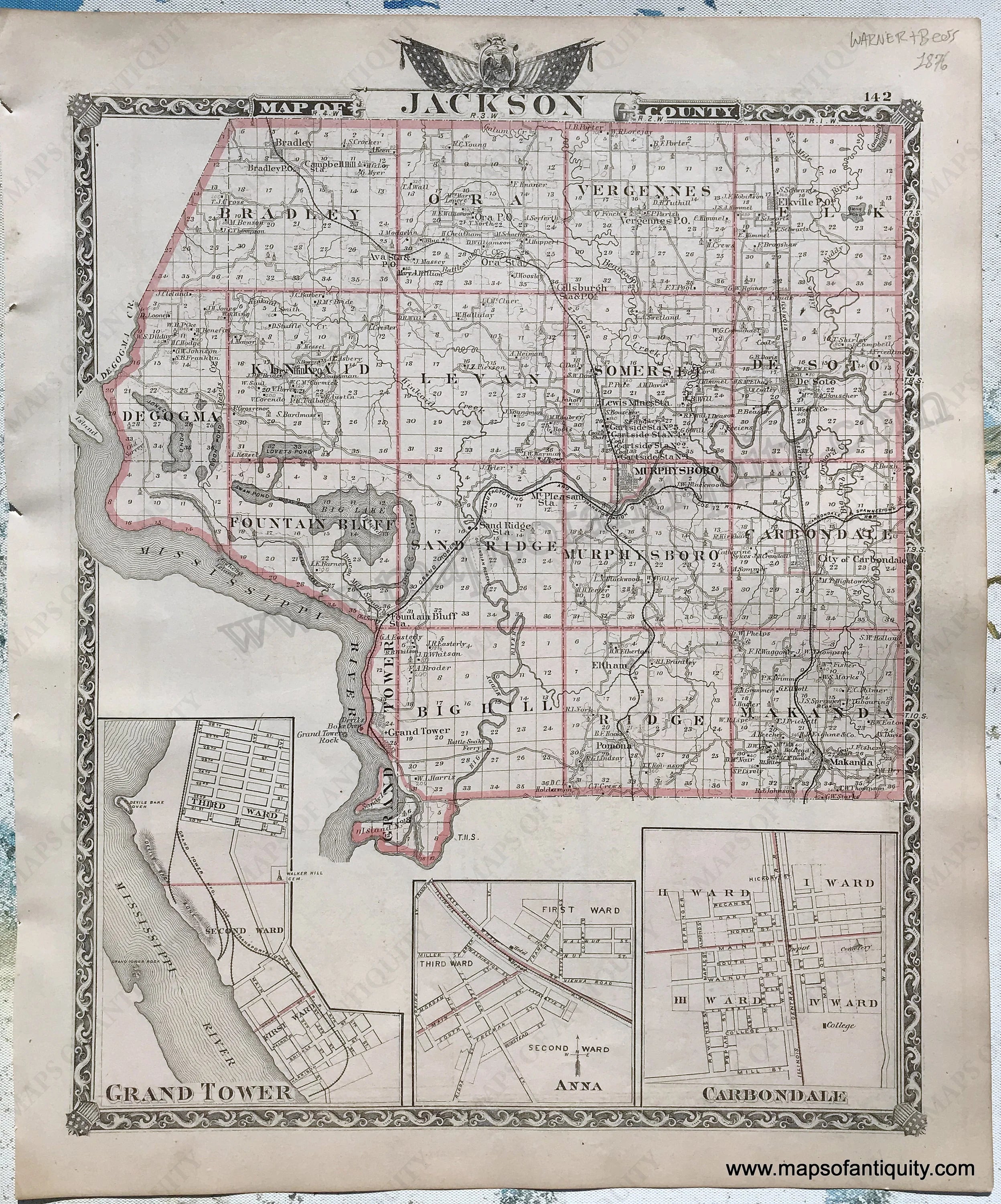 Antique double-sided map: on one side is a map of Jackson County; on the other side is a map of Union County, Illinois. Inset maps of Grand Tower, Anna, and Carbondale, IL. Published in the Atlas of the State of Illinois, published by Warner & Beers with the Union Atlas Co., 1876. Good to very good condition, with some minor spots and overall mild toning that is a bit darker at the paper edge. Maps measure approx.12.5 x 15.5 inches to the neatline, not including the decorative border.
