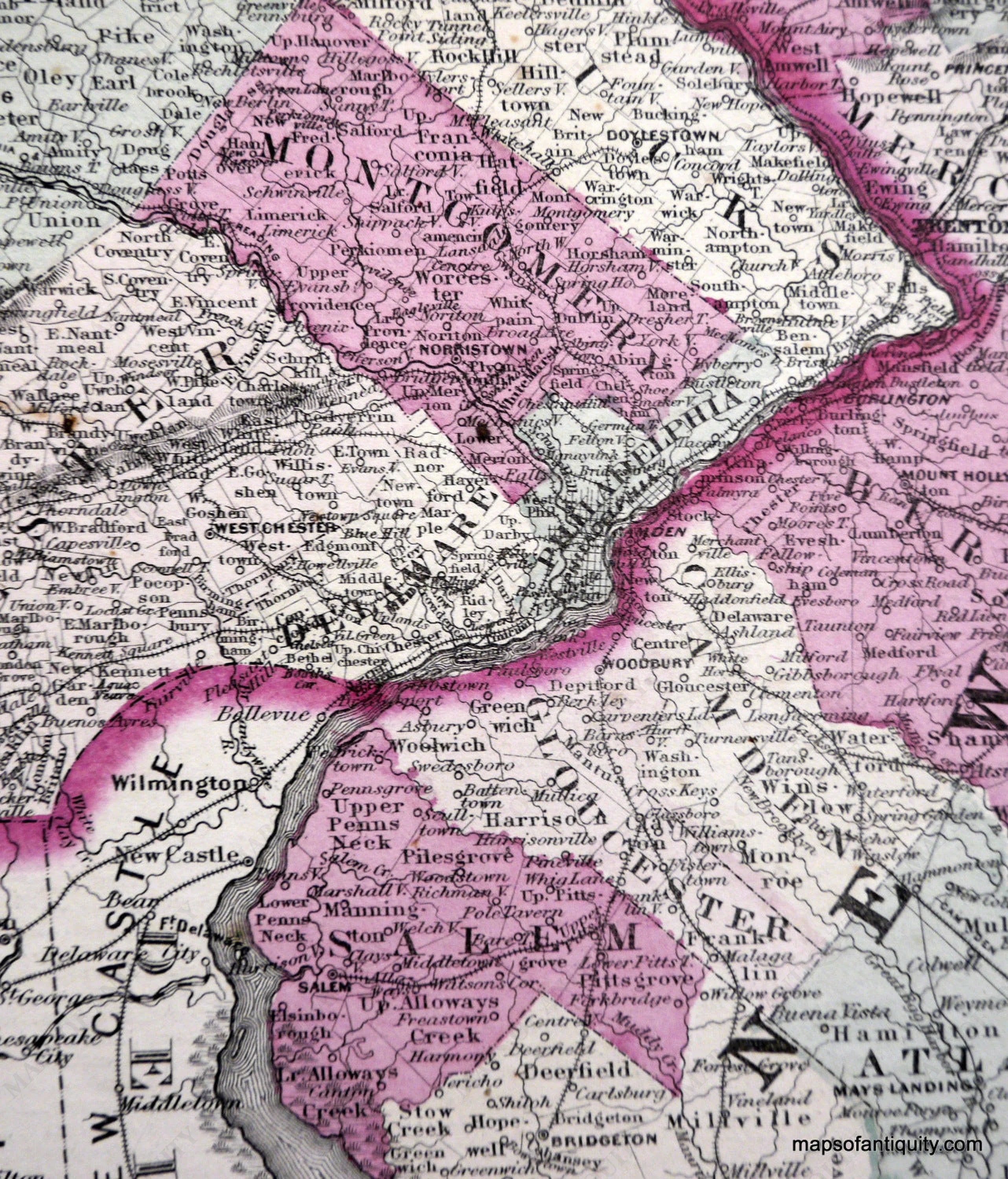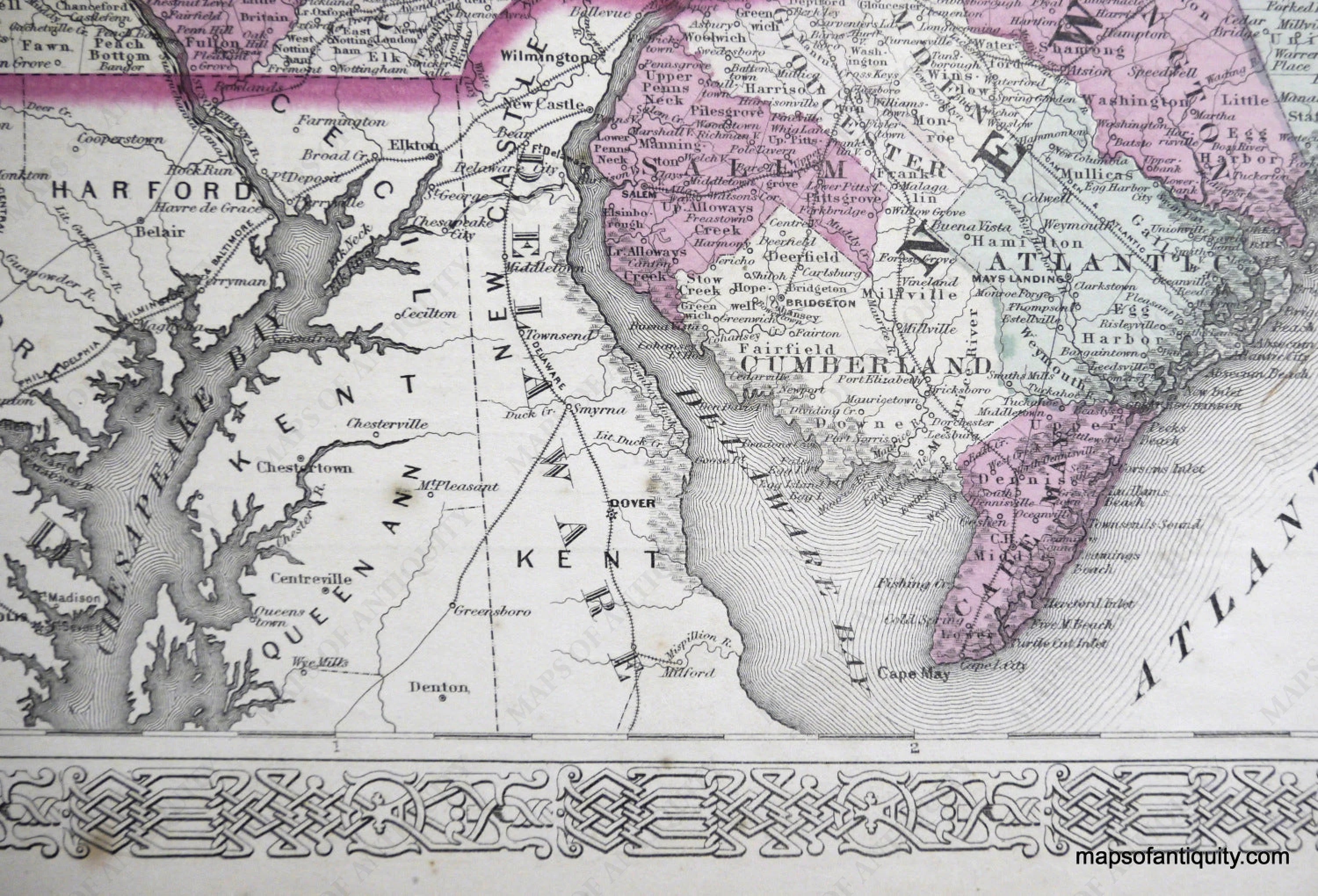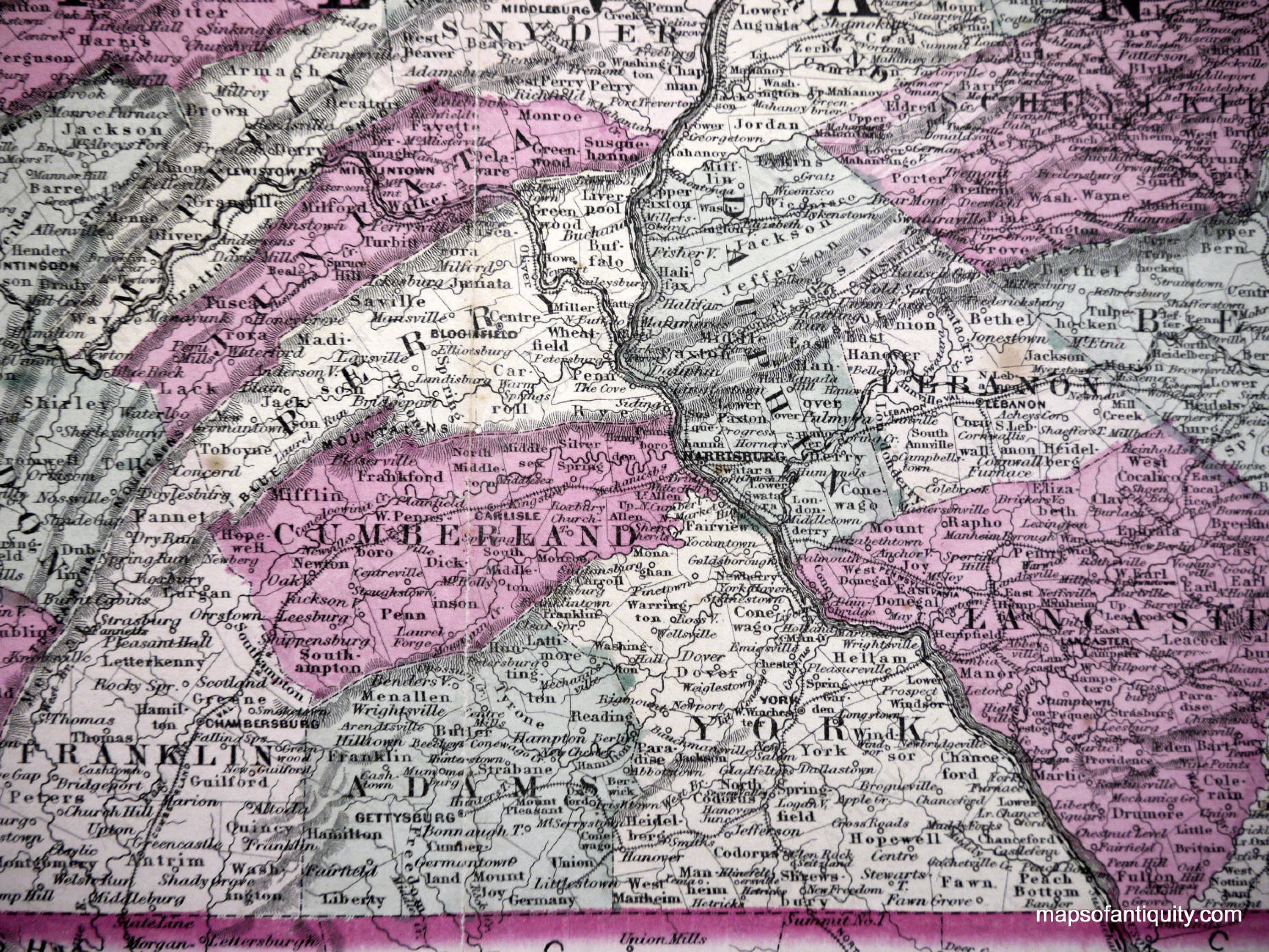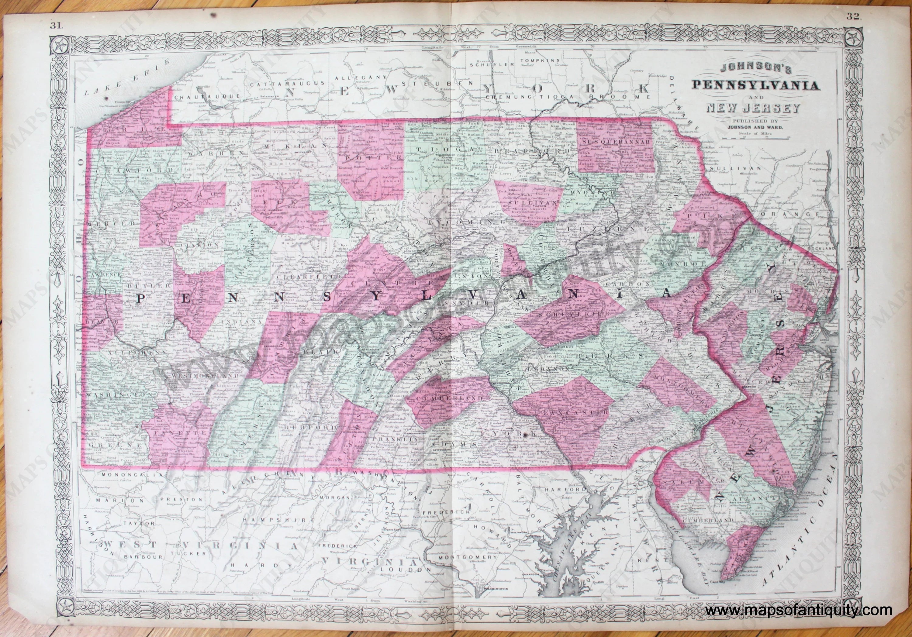 Antique hand-colored map of Pennsylvania and New Jersey at the time of the Civil War by Johnson and Ward, 1864. Shows counties delineated by color, rivers, water bodies, railroads, cities, towns, and some topography including the Appalachian Mountains. Center fold, as issued. Good to Very good condition with mild toning throughout, a few spots of minor foxing, and some seam separation at the bottom of the fold. Measures approx. 17 x 23.5 inches to the outer edge of the decorative border.