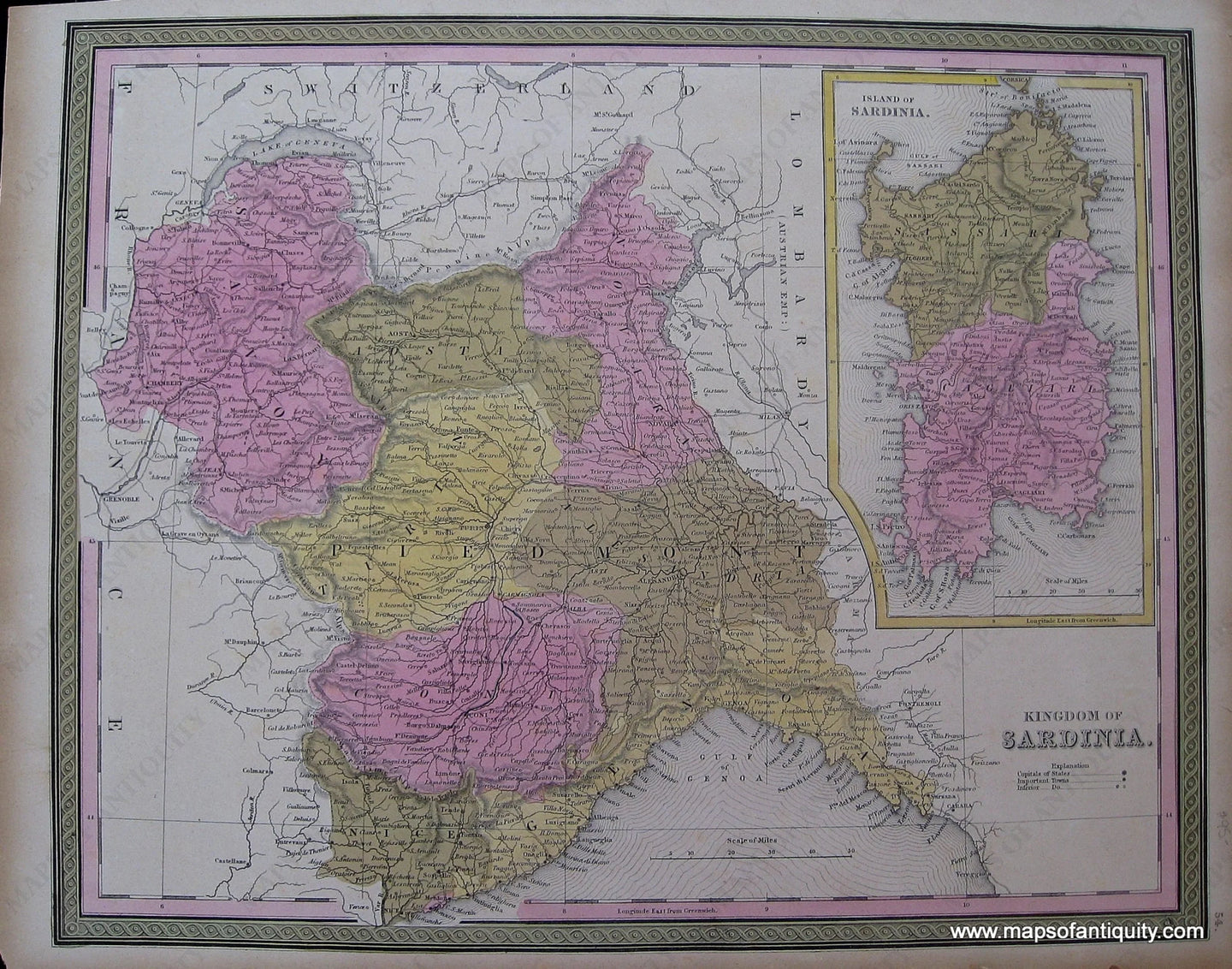 Antique hand colored map of Northern Italy, including Piedmont and Savoy, with inset of the Island of Sardinia. Includes Nice, Monaco, Genoa, Turin, and more. The Kingdom of Sardinia was a country in Southern Europe from the late 13th until the mid-19th century.