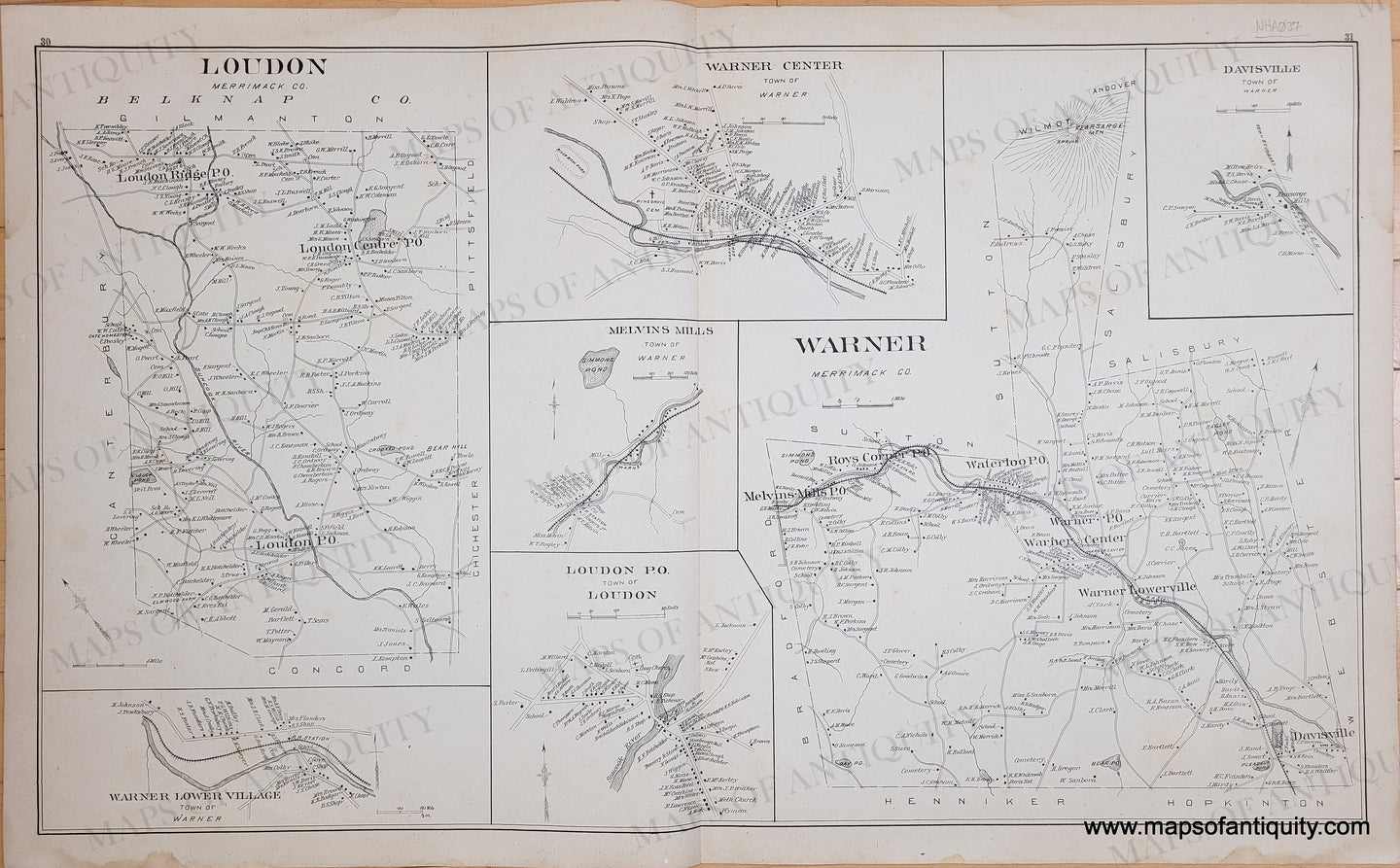 Antique black and white page with maps of Loudon, New Hampshire and Warner, New Hampshire, with additional maps of Warner Lower Village, Warner Center, "Melvins Mills" (Melvin Mills,) vicinity of Loudon Post Office, and Davisville. From the Town and City Atlas of the State of New Hampshire, by D.H. Hurd, 1892. Includes the names of property owners at the time of publication. Center fold, as issued Good antique condition with some toning of the paper, a few areas of wrinkling of the paper, and some spots of foxing/soiling. Measures approx. 26.25 x 16 inches.
