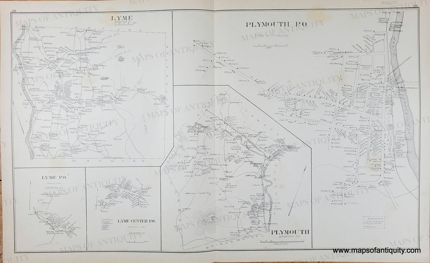 Antique black and white page with maps of the towns of Lyme, and Plymouth, New Hampshire, and additional maps of the vicinities of the Lyme Post Office, Lyme Center Post Office, and the Plymouth Post Office. From the Town and City Atlas of the State of New Hampshire, by D.H. Hurd, 1892. Includes the names of property owners at the time of publication. Center fold, as issued. Very good antique condition with mild toning of the paper, and areas of foxing/soiling. Measures approx. 26.25 x 16 inches.