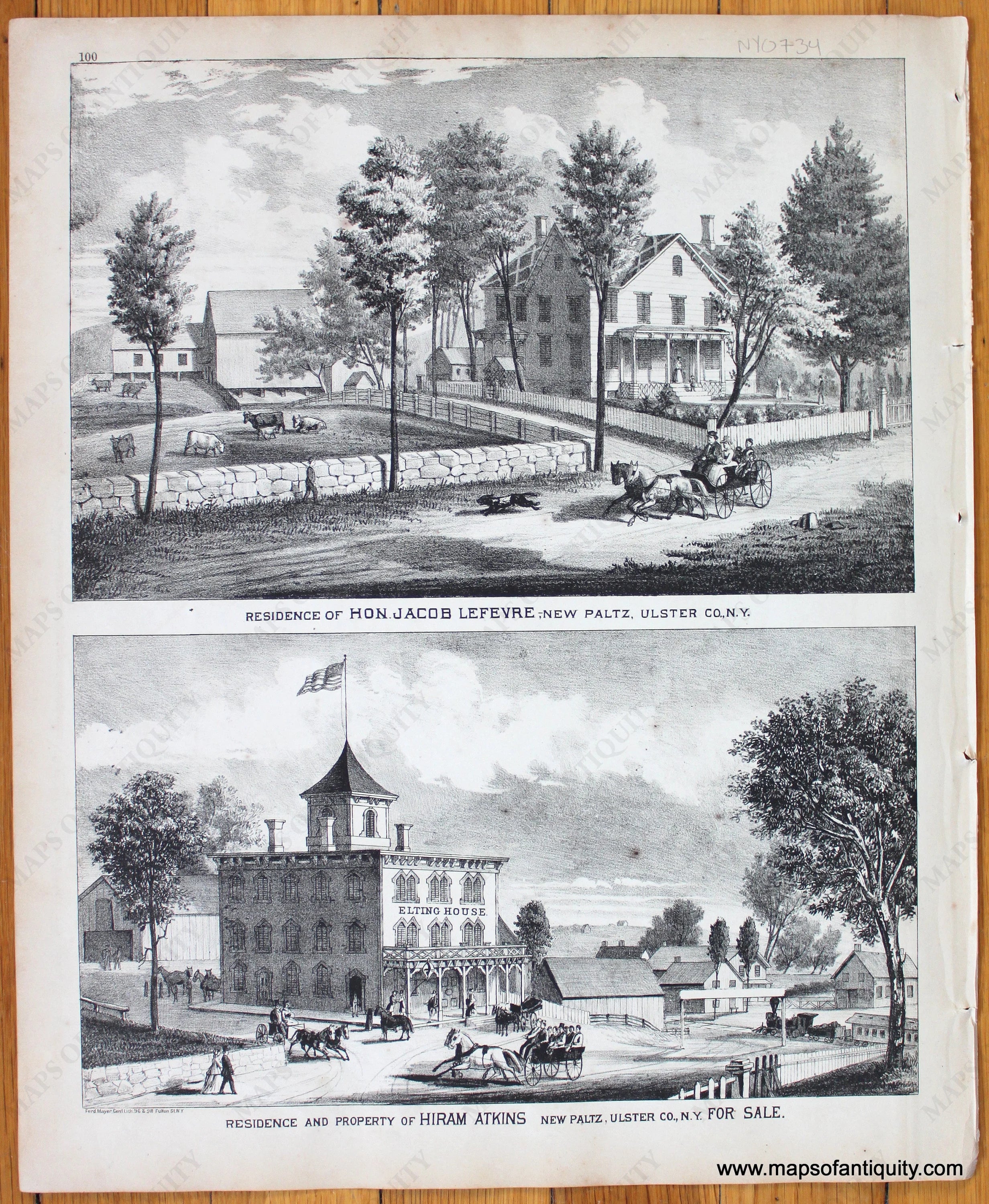 Antique uncolored lithographed engraving from the County Atlas of Ulster New York From Recent and Actual Surveys and Records Under the Superintendence of F.W. Beers and Published by Walker and Jewett in 1875. Mansion House, Monticello, Sullivan County, N.Y., Le Grand Morris Prop'r; Methodist Episcopal Church and Parsonage Ellenville Ulster Co. N.Y, Rev'd David Buck, Pastor; Residence of Hon. Jacob Lefevre, New Paltz, Ulster Co., N.Y.; Residence and Property of Hiram Atkins New Paltz, Ulster Co., N.Y. FOR SALEIn good antique condition with foxing, toning, and minor tears and paper loss at edges. This print measures approximately 11 x 15 inches.
