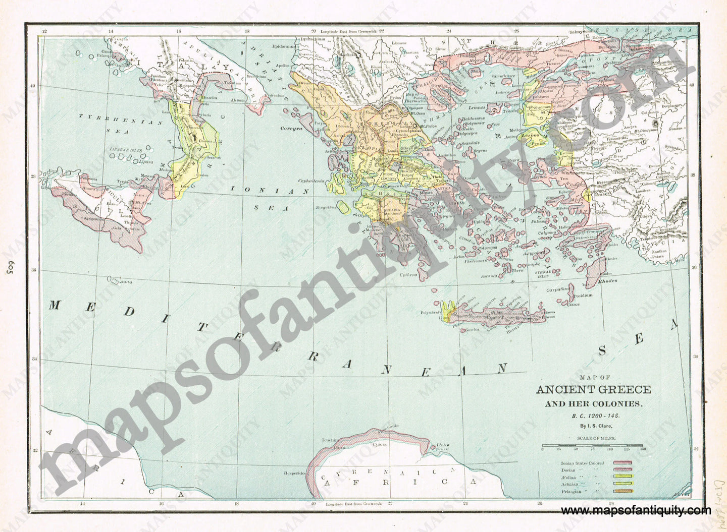 Antique printed color map of Ancient Greece and its colonies between 1200-146 B.C. Colored (with a key) to show the boundaries between the Ionian States, Dorian States, Aeolian States, Achaian States, and Pelasgian States. Very good condition with some slight overall toning. By Cram, 1894, original atlas unknown. Measures approximately 9" x 12.5" to the neatline.