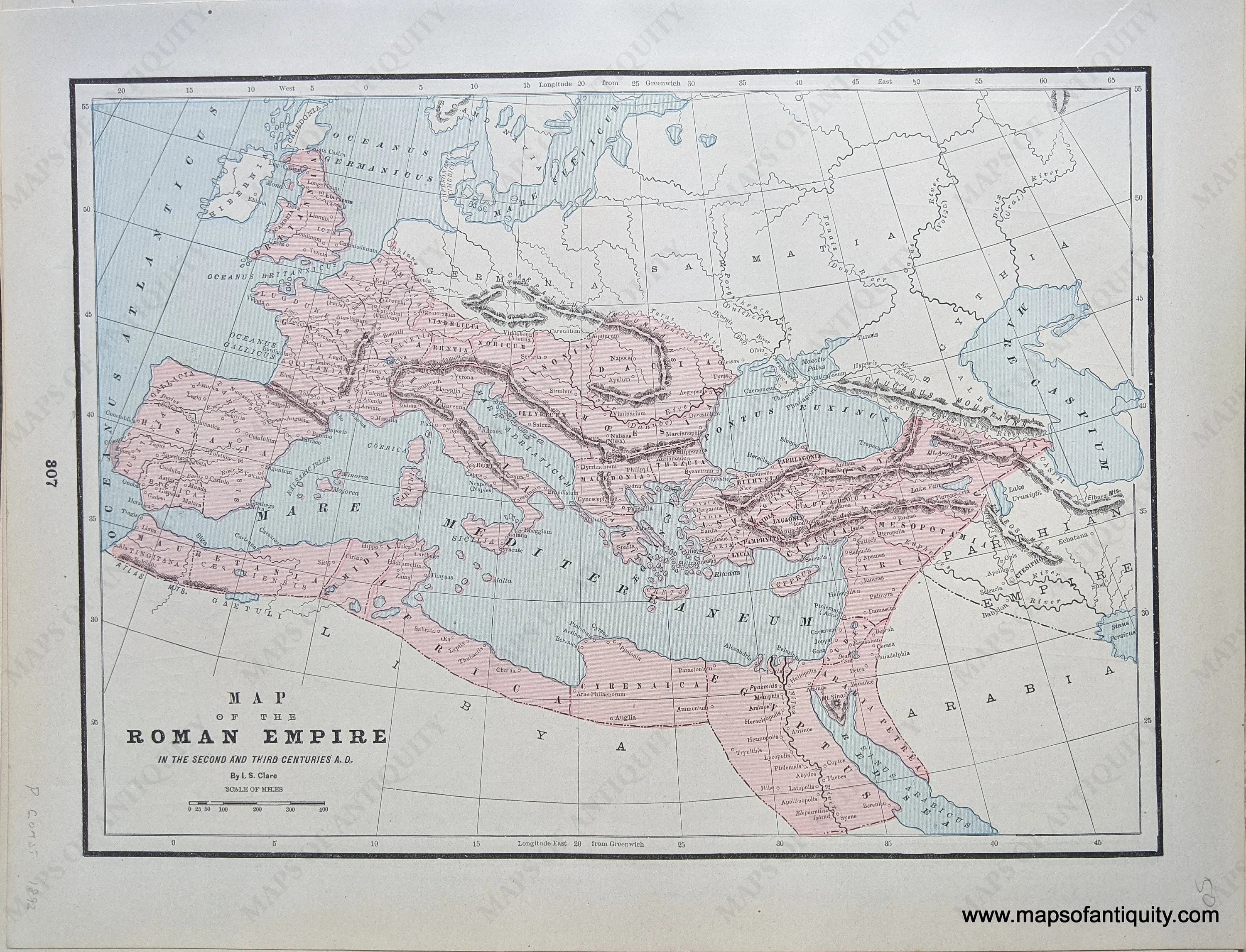 Antique printed color double-sided maps published in "The Pacific Coast and the World" by the Home Library and Supply Association, 1892. Map of the Roman Empire in the Second and Third Centuries A.D. on one side and map of Ancient Italy B.C. 800-222. Very good overall antique condition with some very mild toning/foxing (mainly at the outer edges.) Measure approx. 12 x 9.25" to the neatline.