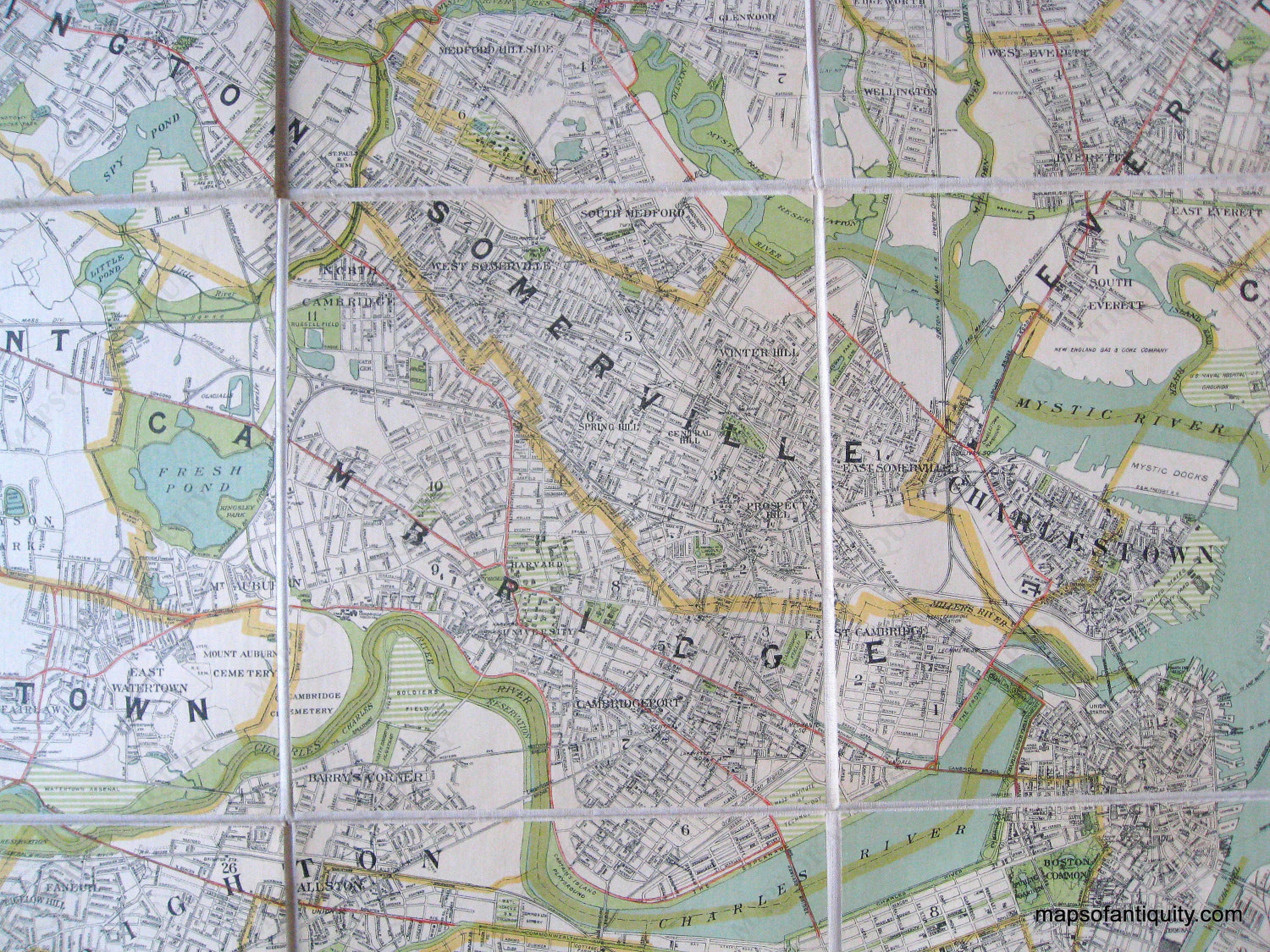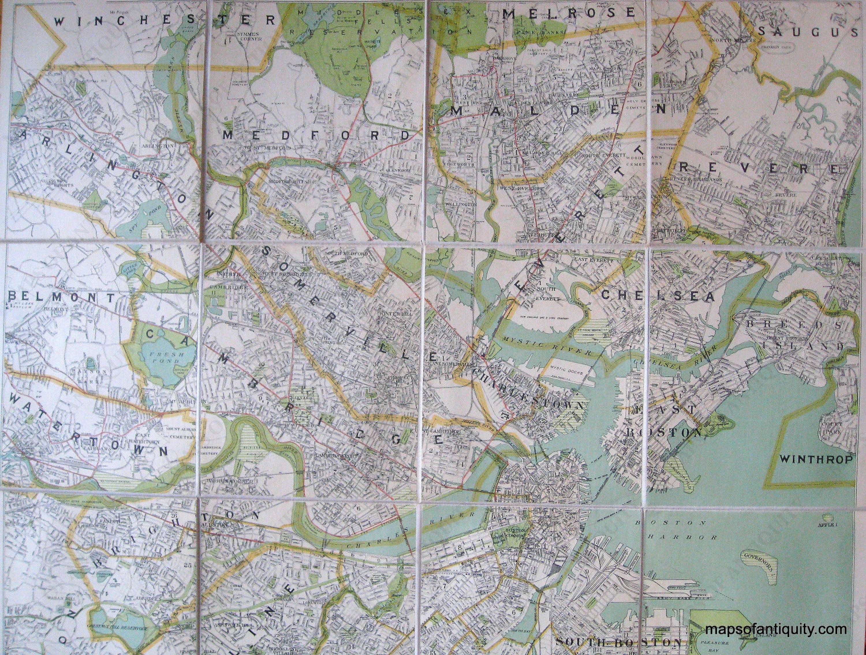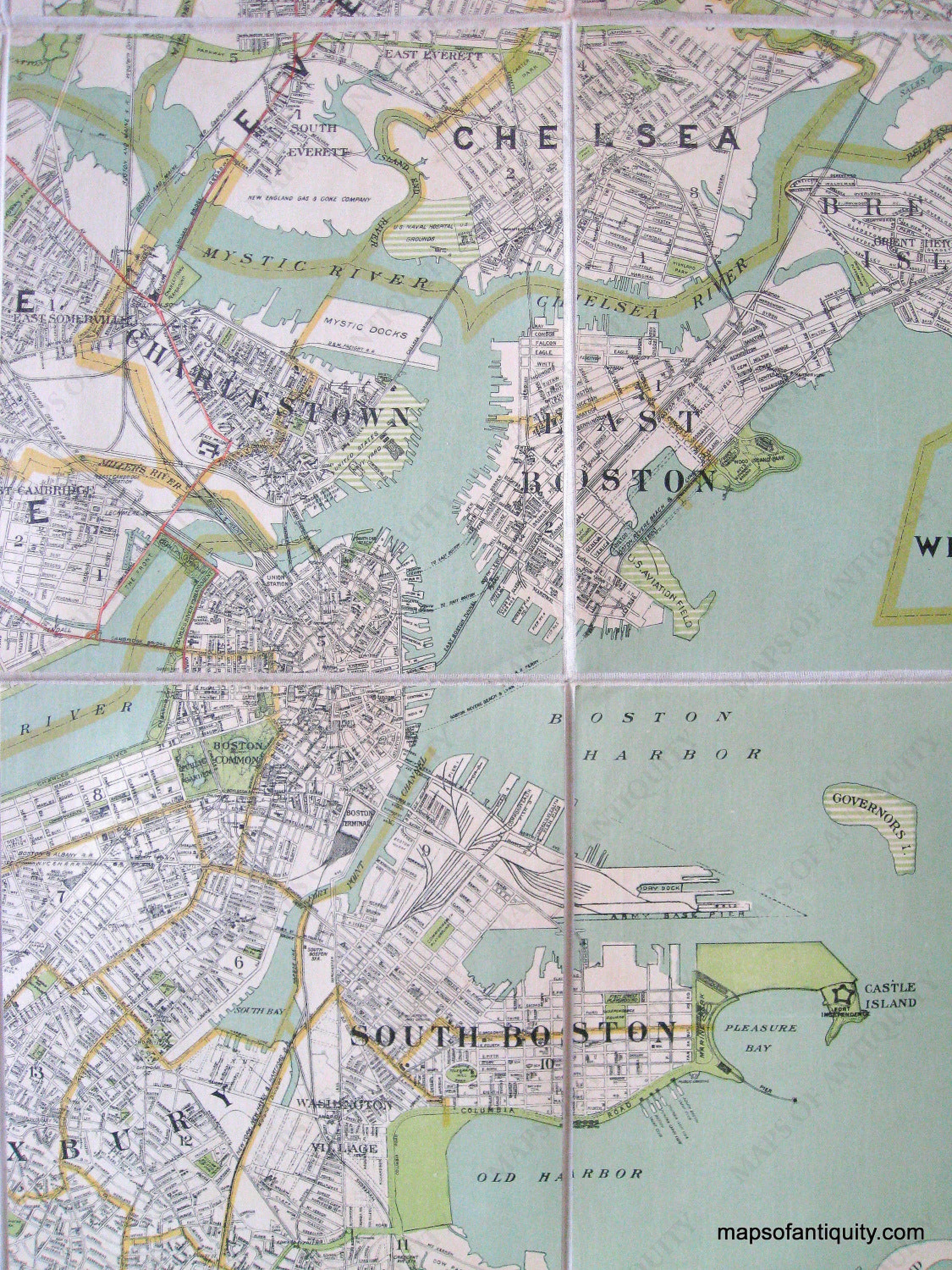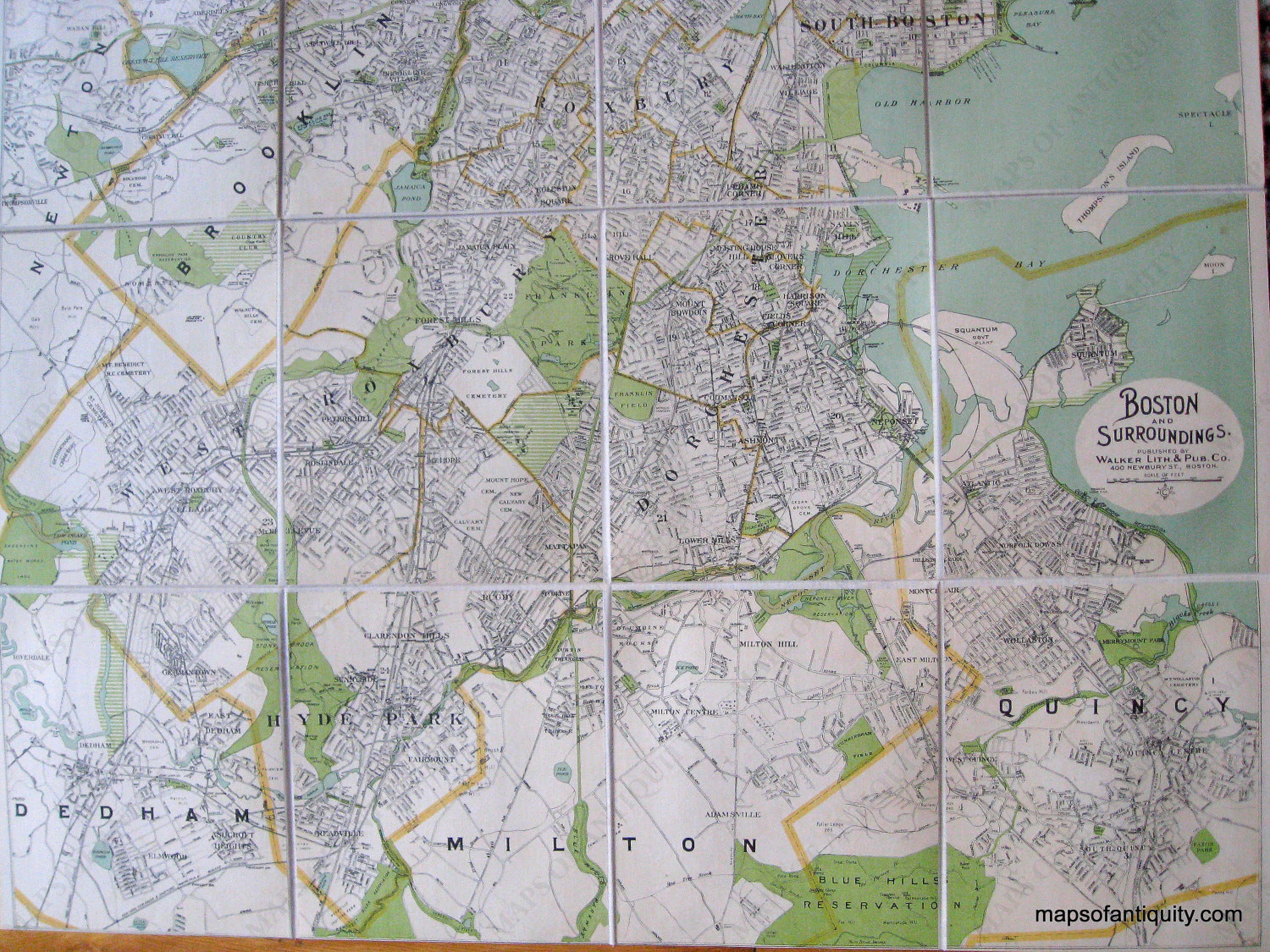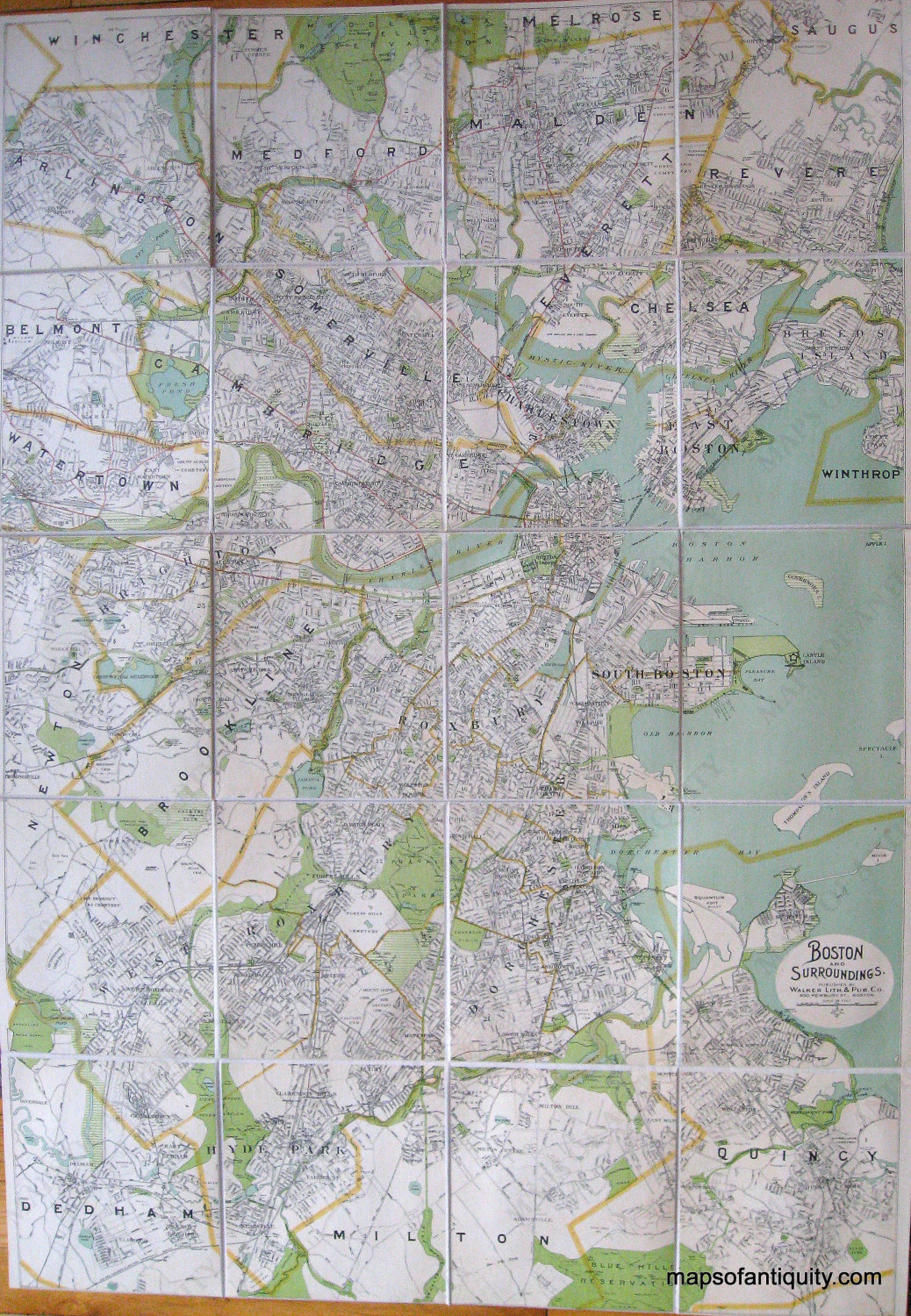 Original color antique folding map of Boston and its surroundings by George H Walker of Boston, published circa 1910. Includes Blue Hills Reservations, Middlesex Fells Reservation, , Mystic River, Fresh Pond, streets, parks, ponds, bridges, buildings, government buildings and properties, lakes, cemeteries, roads, railways, land and water bodies, and more. Backed on linen. Very good overall antique condition. approx. 42 x 29 inches
