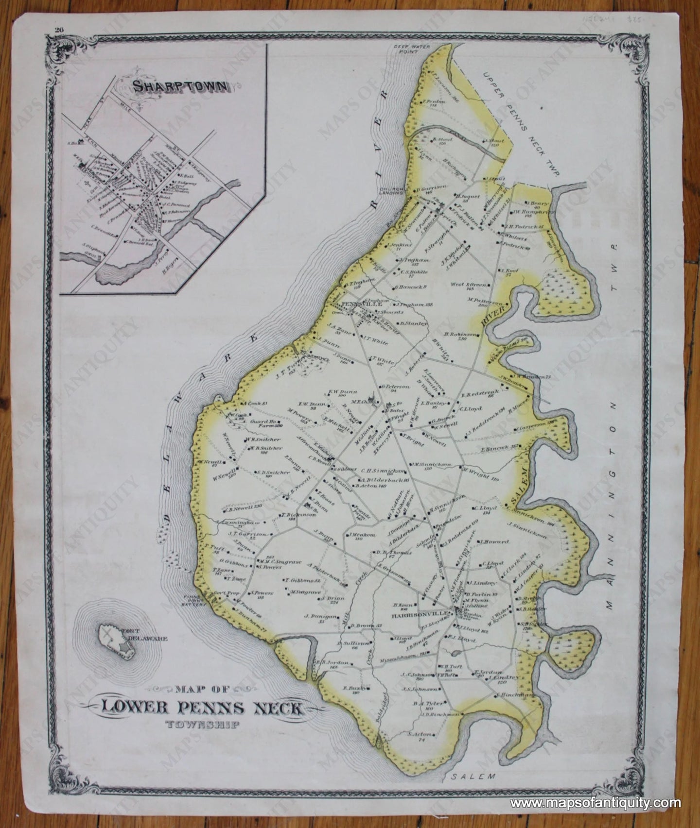 Antique hand colored map of Lower Penns Neck in Salem County, New Jersey, from the New Historical Atlas of Salem & Gloucester Counties by Everts & Stewart, 1876. Shows major roads, railroads, bodies of water, village centers, buildings with property owners names, and more. Inset map of Sharptown. Attractive decorative border. Good antique condition with overall toning, some minor stains, and some wear and tears at the paper edges. Should frame nicely. Approx. 16 x 12.5 inches to the neatlines.