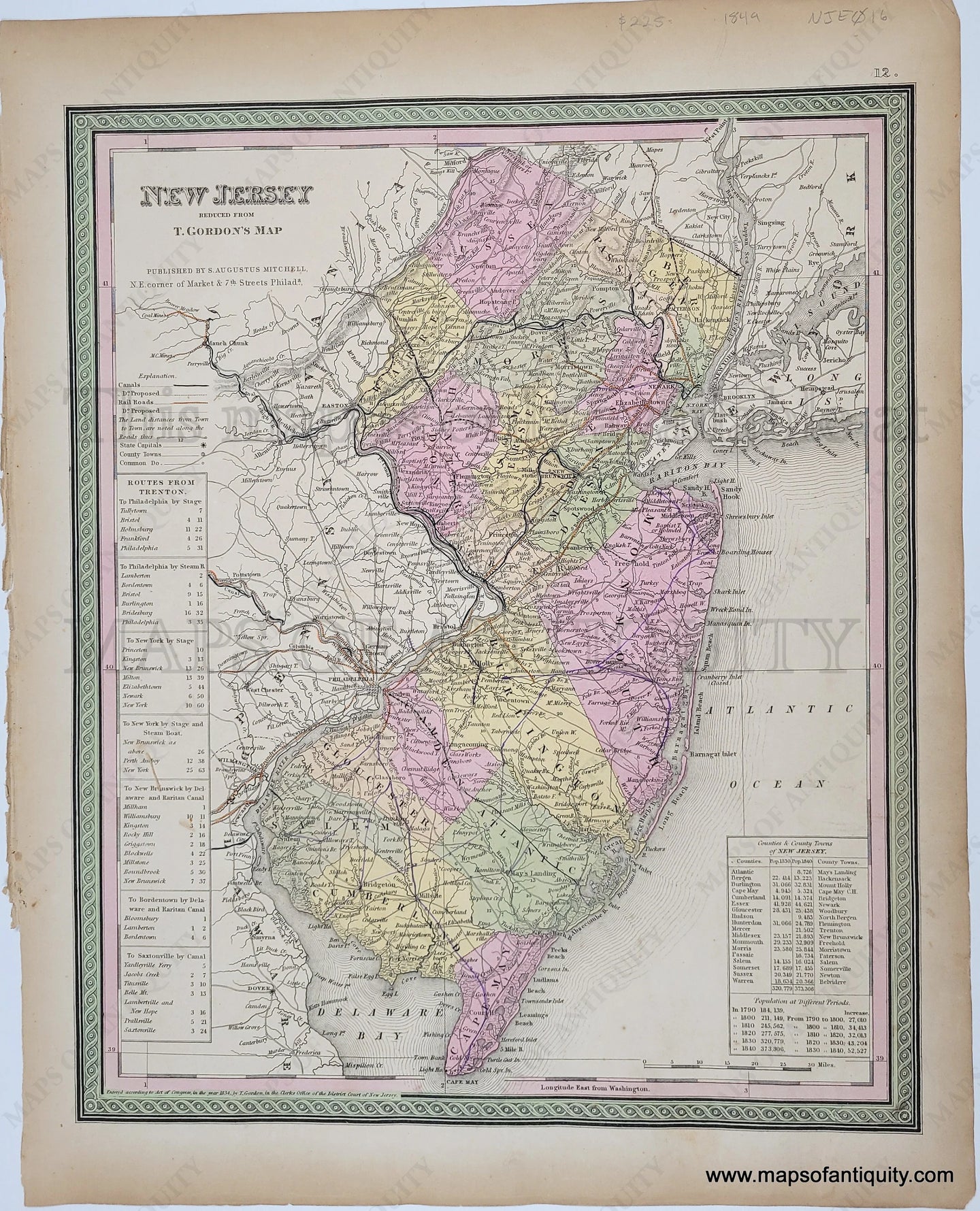 Antique hand-colored map, from S. Augustus Mitchell's "A New Universal Atlas, Containing Maps of the Various Empires, Kingdoms, States and Republics of the World, With a Special Map of Each of the United States, Plans of Cities, etc.", 1849. Very good overall antique condition with minor toning, some small tears at paper edges. A previous owner added some pen marks. Measures approx. 16 x 13 inches to the neatline.