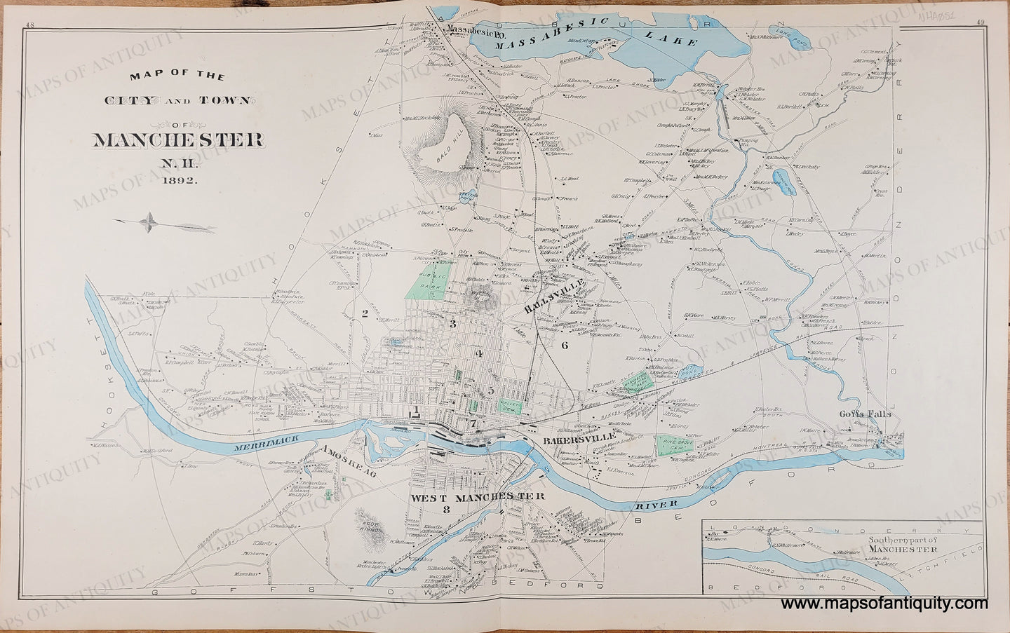 Antique hand-colored map of Manchester, New Hampshire, with an inset map showing the southern part of Manchester. Includes the names of property owners at the time of publication, as well as railroads, topographical details, landmarks/points of interest, etc. From the Town and City Atlas of the State of New Hampshire, by D.H. Hurd, 1892. Center fold, as issued. Very Good antique condition with very mild toning throughout, and a couple spots of very minor foxing. Measures approx. 26.25 x 16 inches.