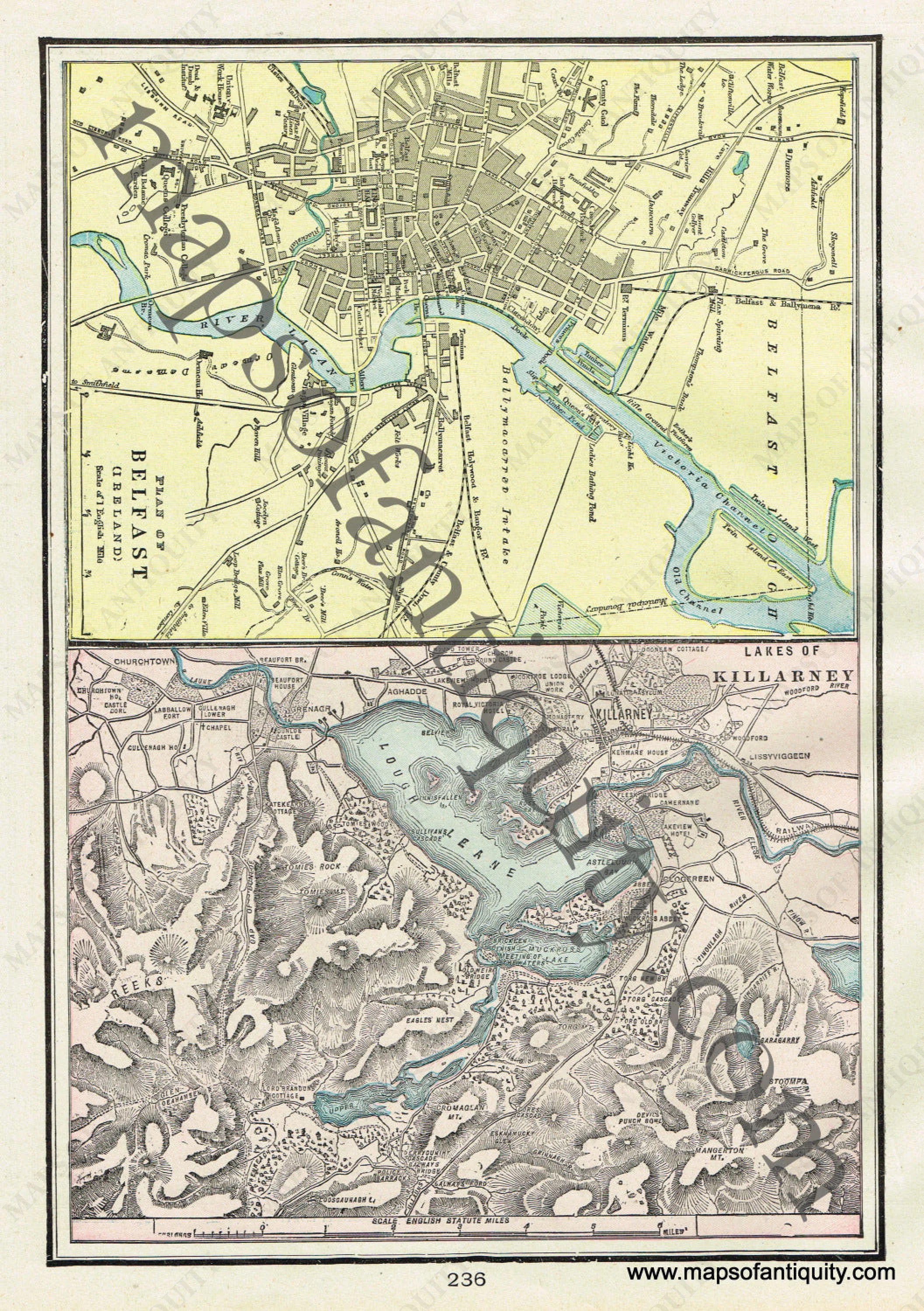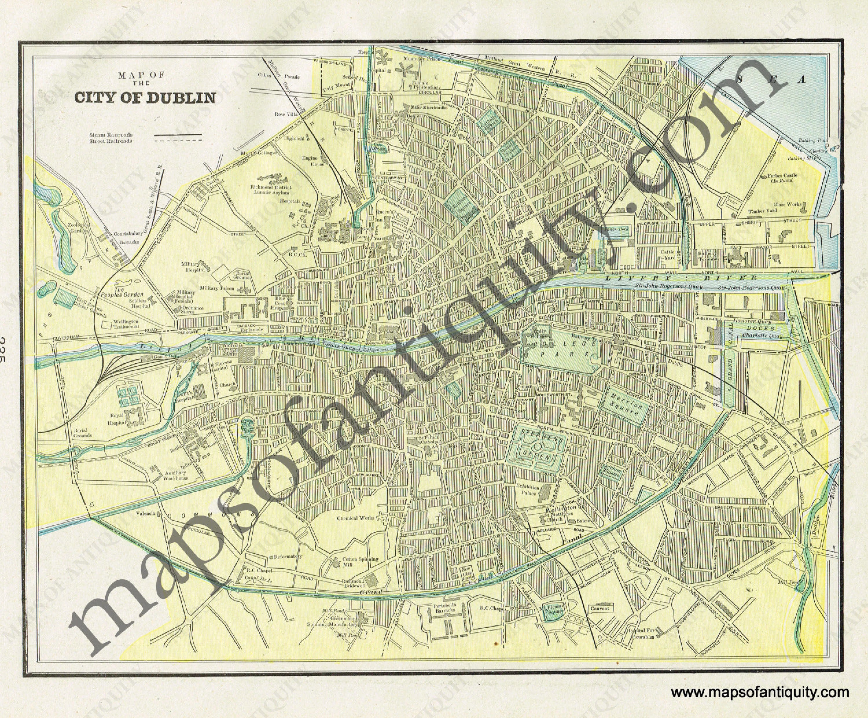 Antique printed color city map of Dublin, Ireland (Recto). Indicates "street railroads" and steam railroads. Verso: A map of the city of Glasgow (Scotland) and Plan of Dundee. The maps label city streets, bodies of water, as well as some points of interest (including the "Civil Service Cricket Grouunds," Lunatic Asylums, Hospitals, and Workhouses in Dublin). Very good condition with some slight toning. By Cram, in Cram's Unrivaled Family Atlas of the World, 1898. Recto map (Dublin) measures approximately 9" x 11.75" to the neatline. Map of Glasgow measures approx. 6" x 8" to the neatline. Map of the Dundee measures approx. 5.75" x 8" to the neatline.