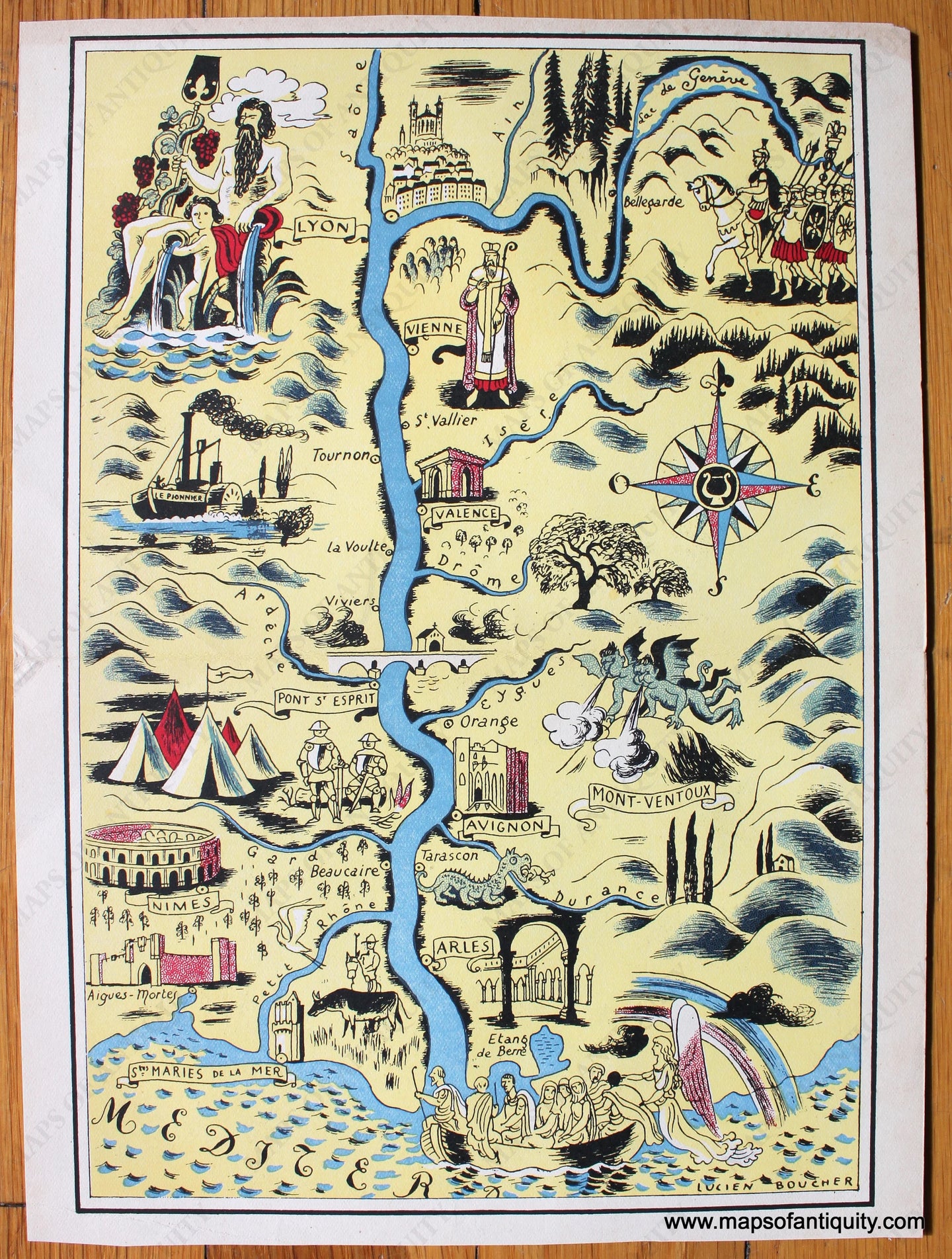 Antique printed color map of the area around the River Rhone, by Lucien Boucher, 1944. Includes Arles, Nimes, Avignon, Valence, Vienne, and Lyon. We have seen this map called the Map of the Three Marys. Very good condition with a center fold as issued and some toning at the paper edges. Measures approx. 10 x 6.75 inches.