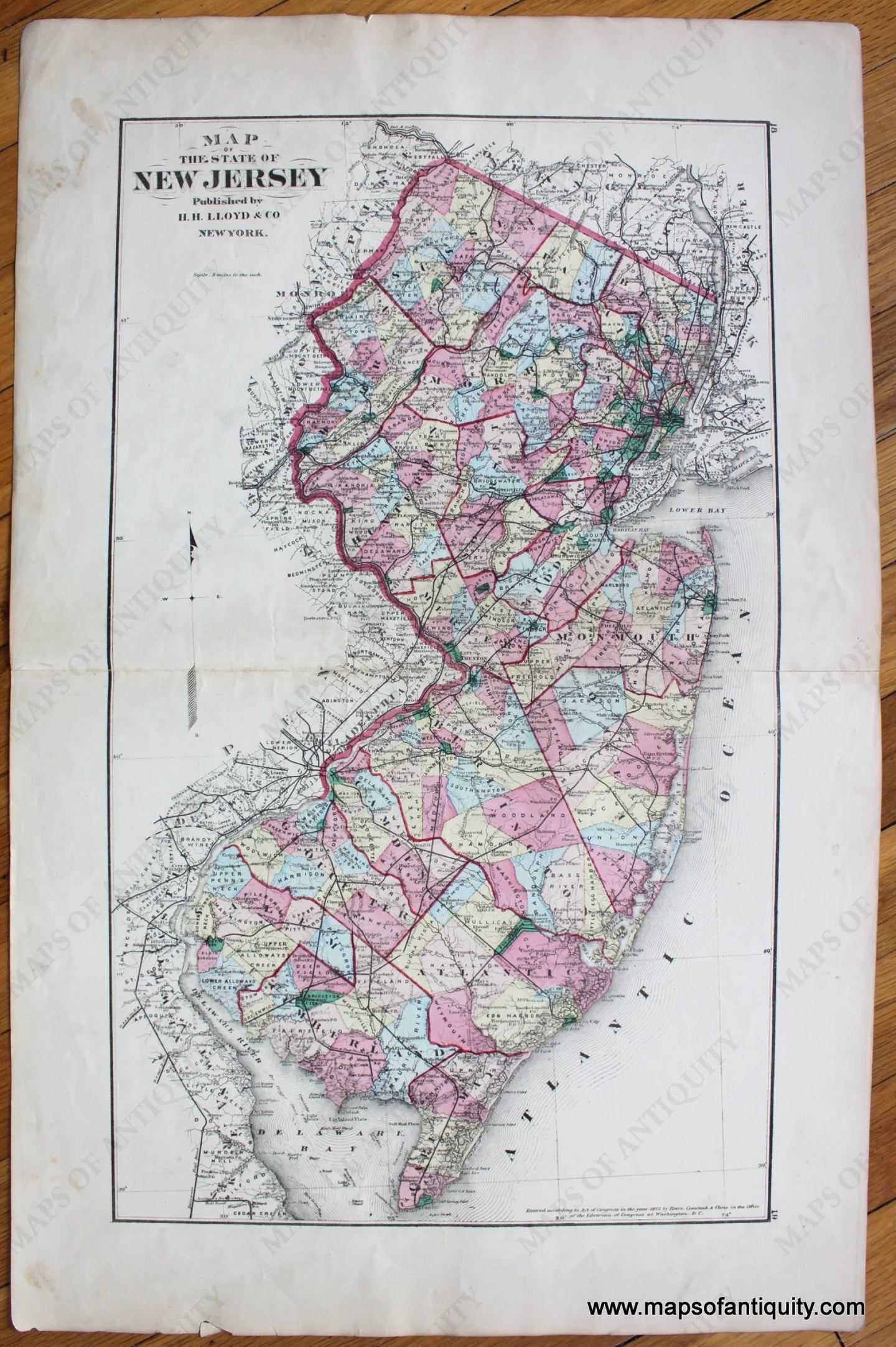 Antique hand colored map of the state of New Jersey, from the Atlas of Bergen Co. New Jersey, 1872, by Beers, Comstock & Cline, showing counties, townships, railroads, and topography. Good to very good condition with overall light toning, 3 inch seam separation on right side, minor surface soiling mostly in margins, measures 22 x 13.25 inches.