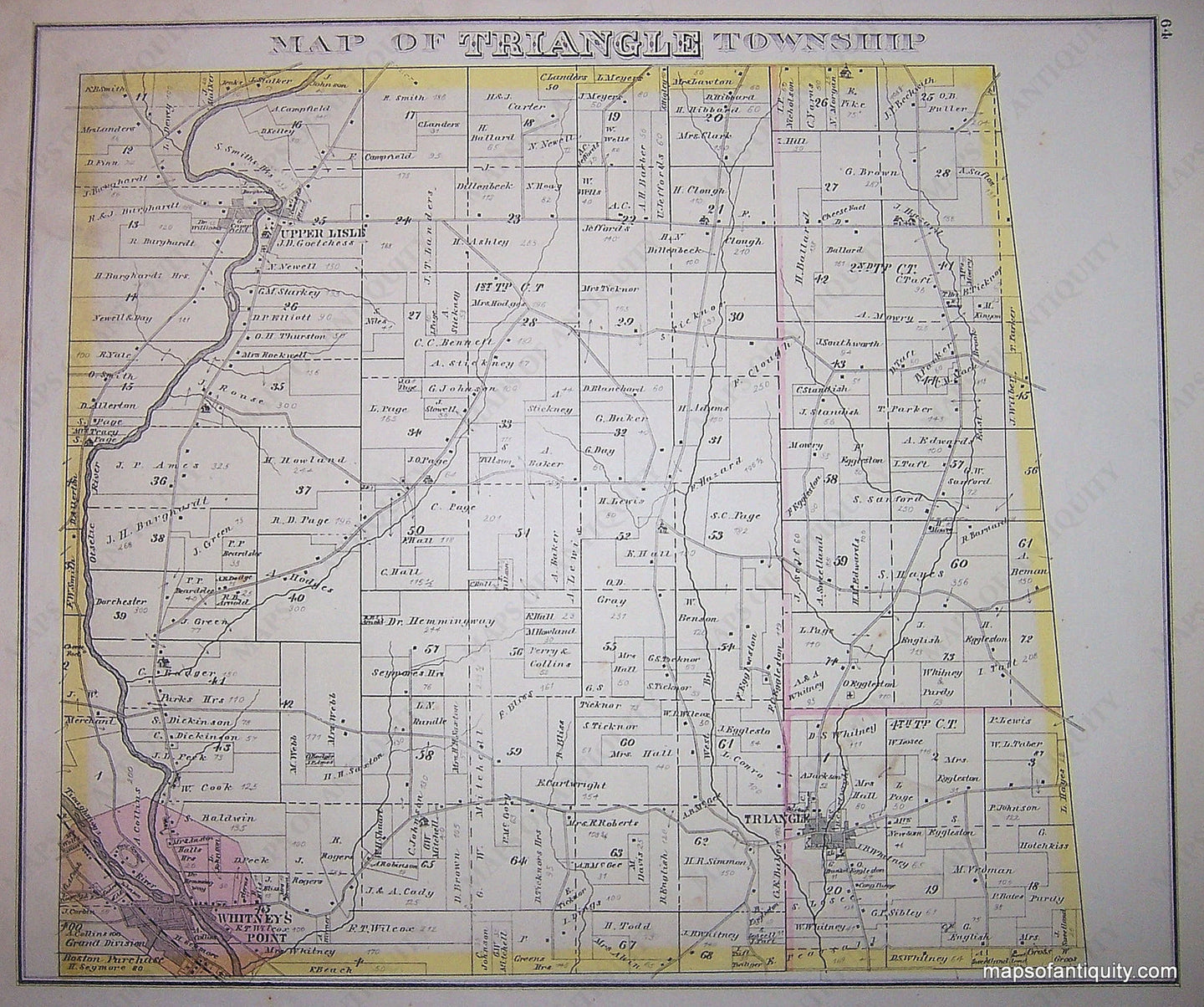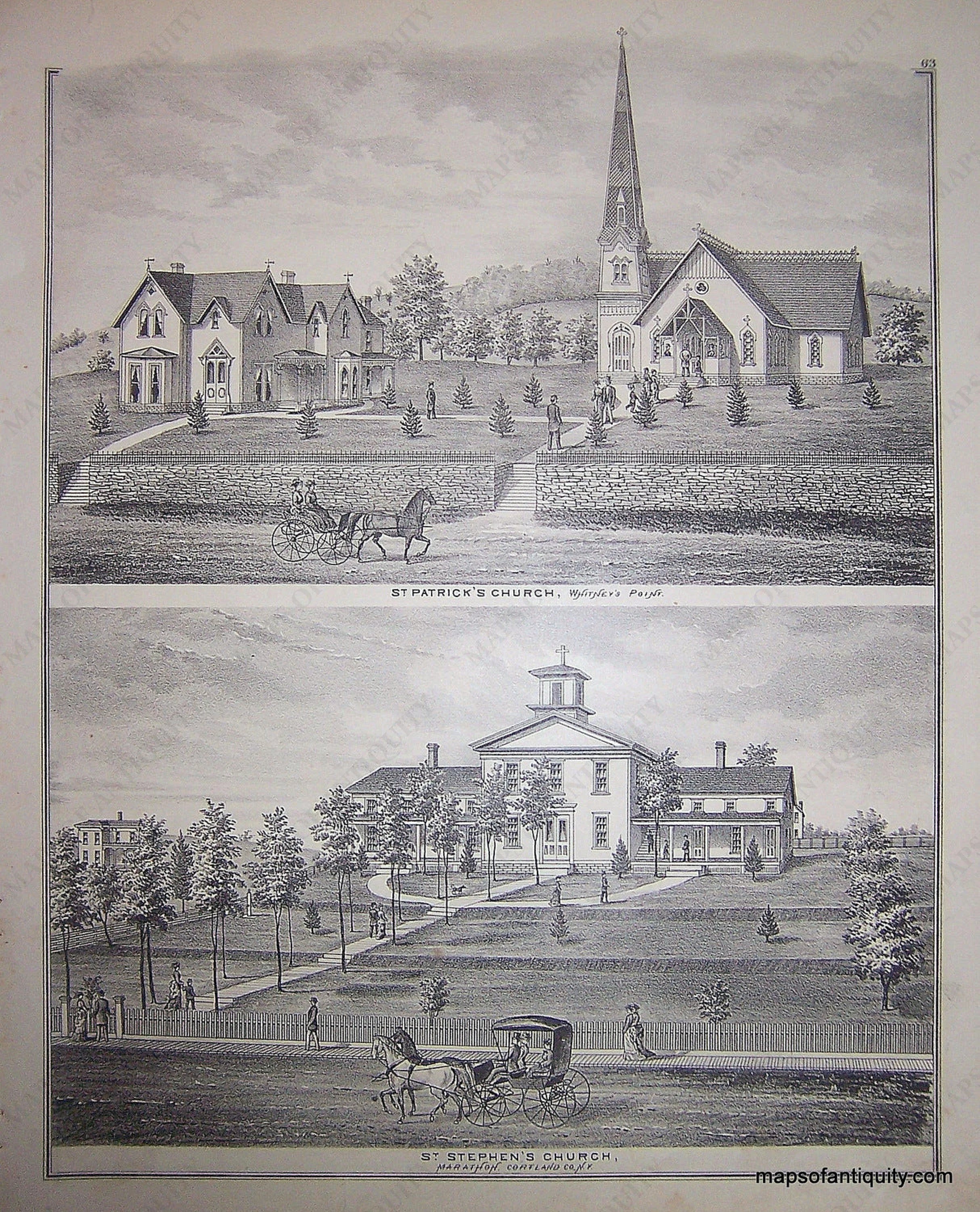 Antique map from the 1876 Broome County Atlas by Everts, Ensign & Everts. Double-sided. Reverse of page contains images of St. Patrick's Church and St. Stephen's Church. This piece measures approximate 15 x 12 inches and is in Very Good antique condition with some minor foxing and discoloration throughout.