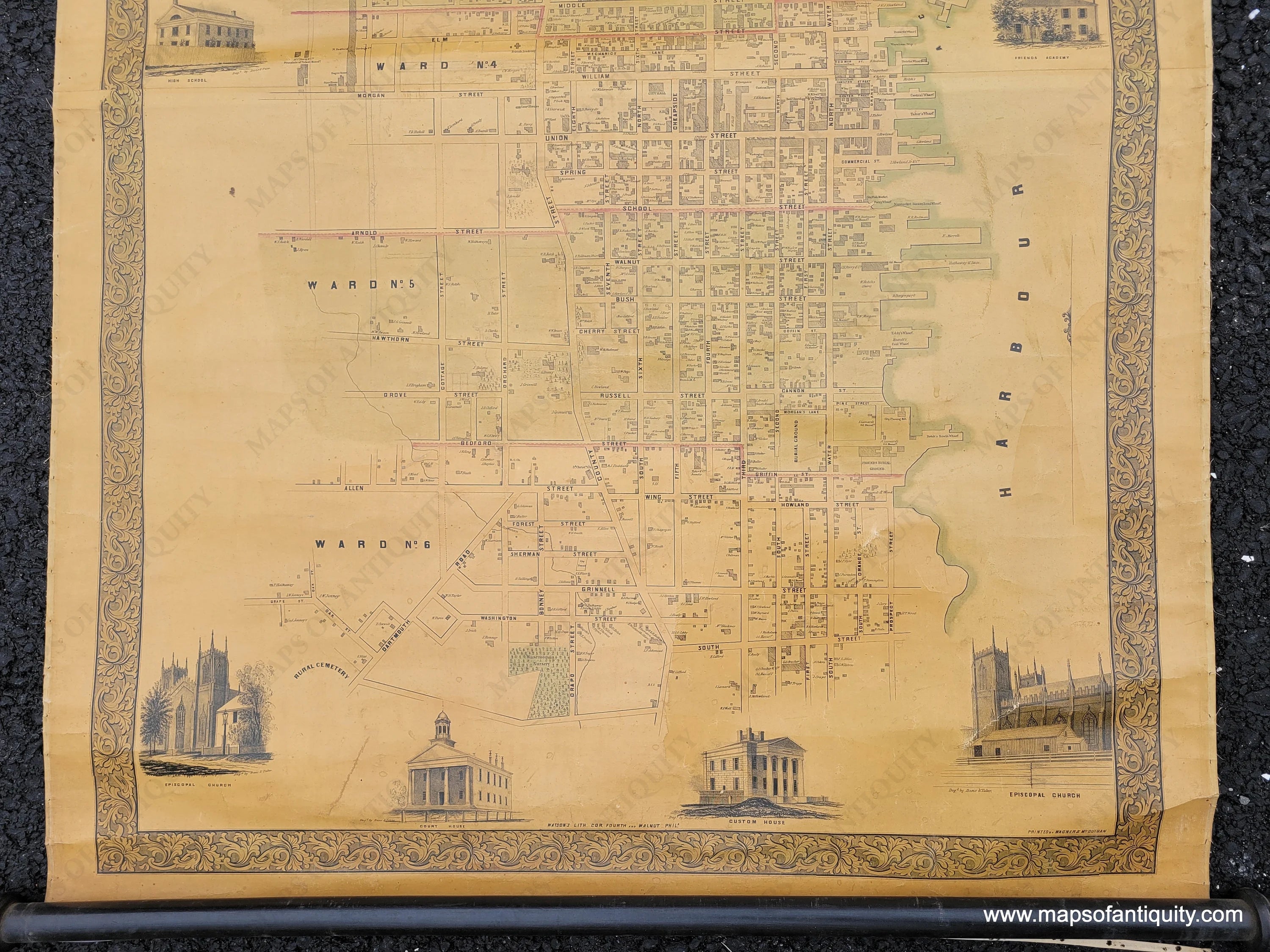Antique hand-colored wall map of New Bedford, MA, from original surveys by J.C. Sidney, published by Collins & Clark, printed by Wagner & McGuigan, 1850. This scarce map is rarely available for sale and can generally only be found in the collections of Harvard and Princeton. It is colored by ward and includes street names, property owners of the time, the many wharves of this important whaling town, and illustrations of notable buildings, including City Hall, the Court House, the Customs House, Wamsutta Mills, and several churches. A sumptuous decorative border surrounds the map, which is on original wooden rods. It could be displayed in a shadow box frame, removed from the rods, or hung as it is (out of direct light to prevent fading). Good original condition, with some water stains at the top and overall yellowing due to varnish (almost all wall maps were varnished and are now a warm honey color from the varnish). This map has been removed from the rods- if you would like to purchase it with rods, please let us know (no additional cost). Measures approx. 45 x 30 inches to the outer edge of the decorative border and approx. 50 x 37.5 inches including the rods.