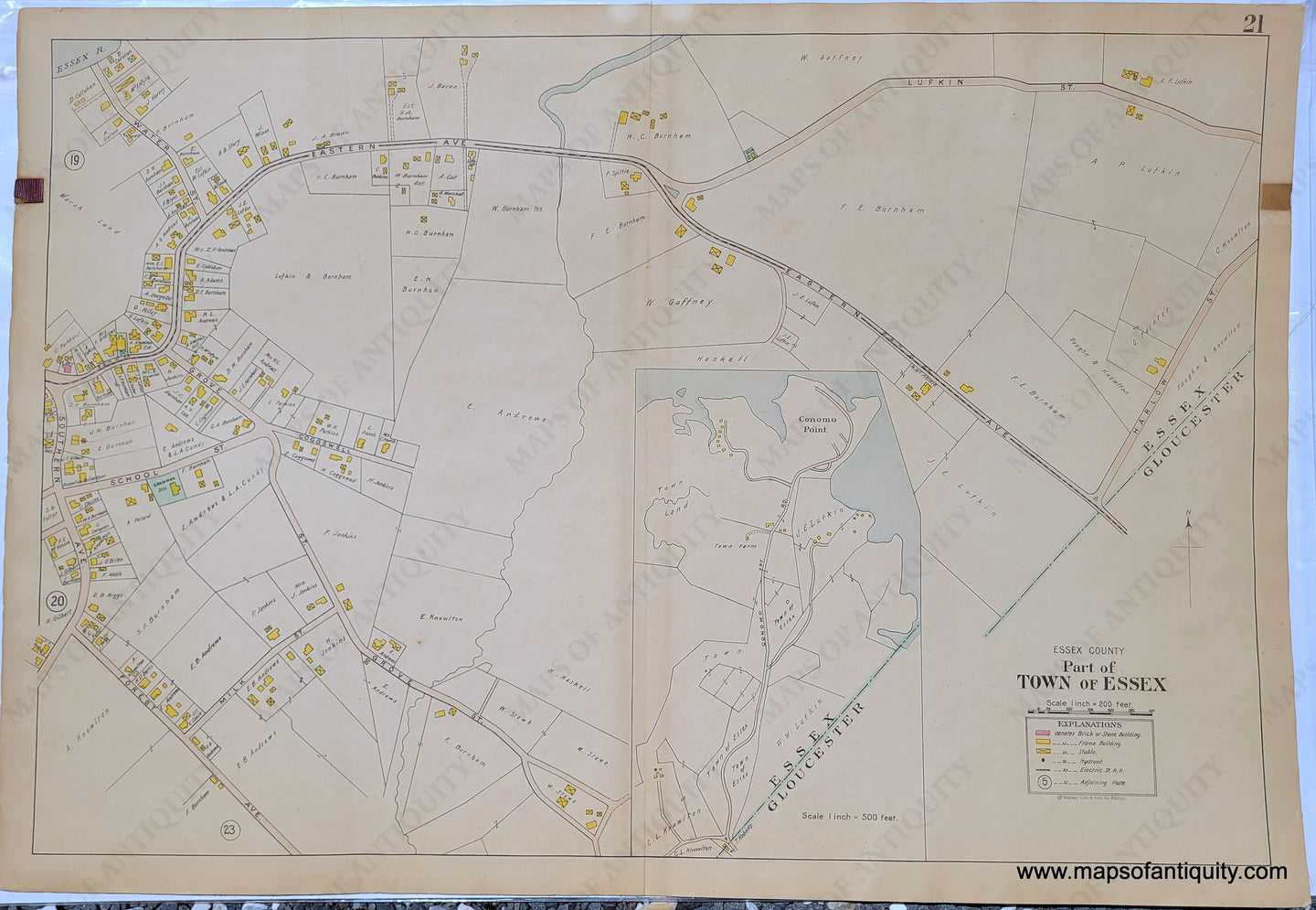 Antique map from the Atlas of Central Essex County, Massachusetts 1910, by Walker. With property owners names. Fair to good condition with overall toning and wear at the page edges, some stains and writing from a previous owner. Measures approx. 20 x 29.75 inches to the neatline.