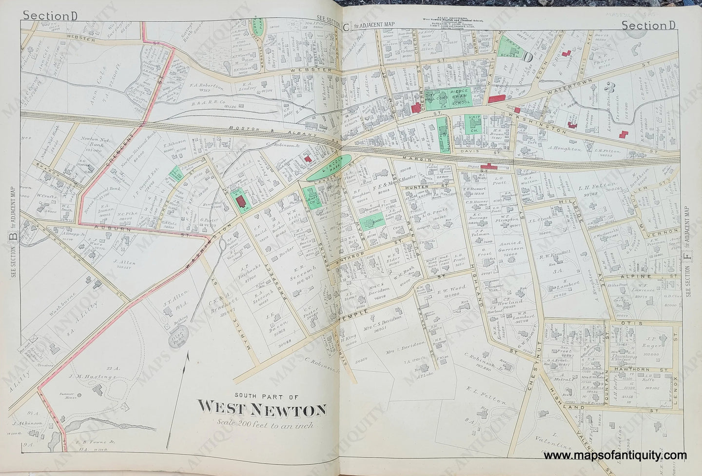 Antique map from the Atlas of the City of Newton, by J.B. Beers & Co., 1886. Shows streets, railroads, some topography, and property owners' names. Buildings are colored thus: grey is frame (wood), red is brick, blue is stone. Includes the City Hall and Lincoln Park. Very good condition with some small minor spots and slight seam separation. Measures approx. 17.75 x 28.25 inches to the neatline.