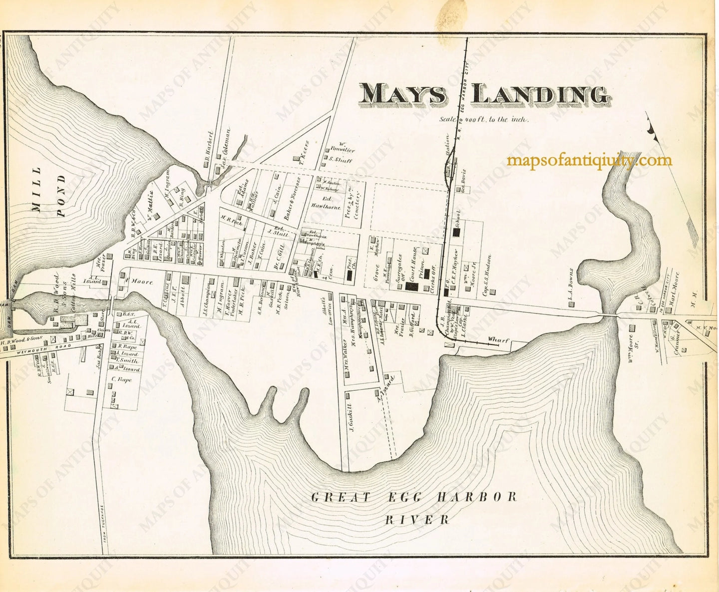 New Jersey Coast Atlas hand colored map showing property owners and buildings of interest. Mays Landing is in Hamilton Township, Atlantic County, New Jersey. Measures approximately 12" x 10", very good condition with one spot in top right side margin.