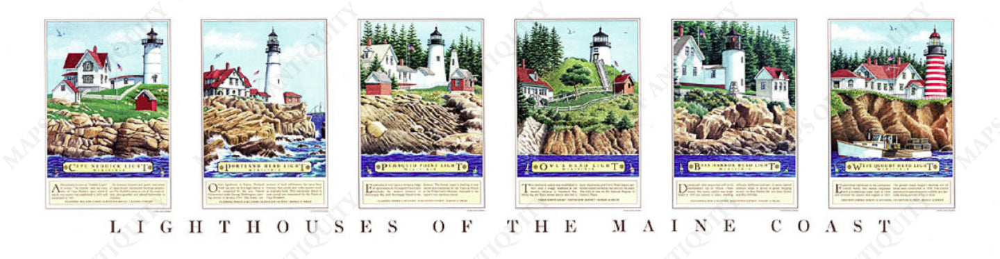 Modern Print. Printed color, Maine Lighthouses: Cape Neddick (Nubble) , Portland Head, Pemaquid Point, Owl's Head, Bass Harbor, West Quoddy Head. By Dana Gaines, 1996. Measures 8 x 32 inches.