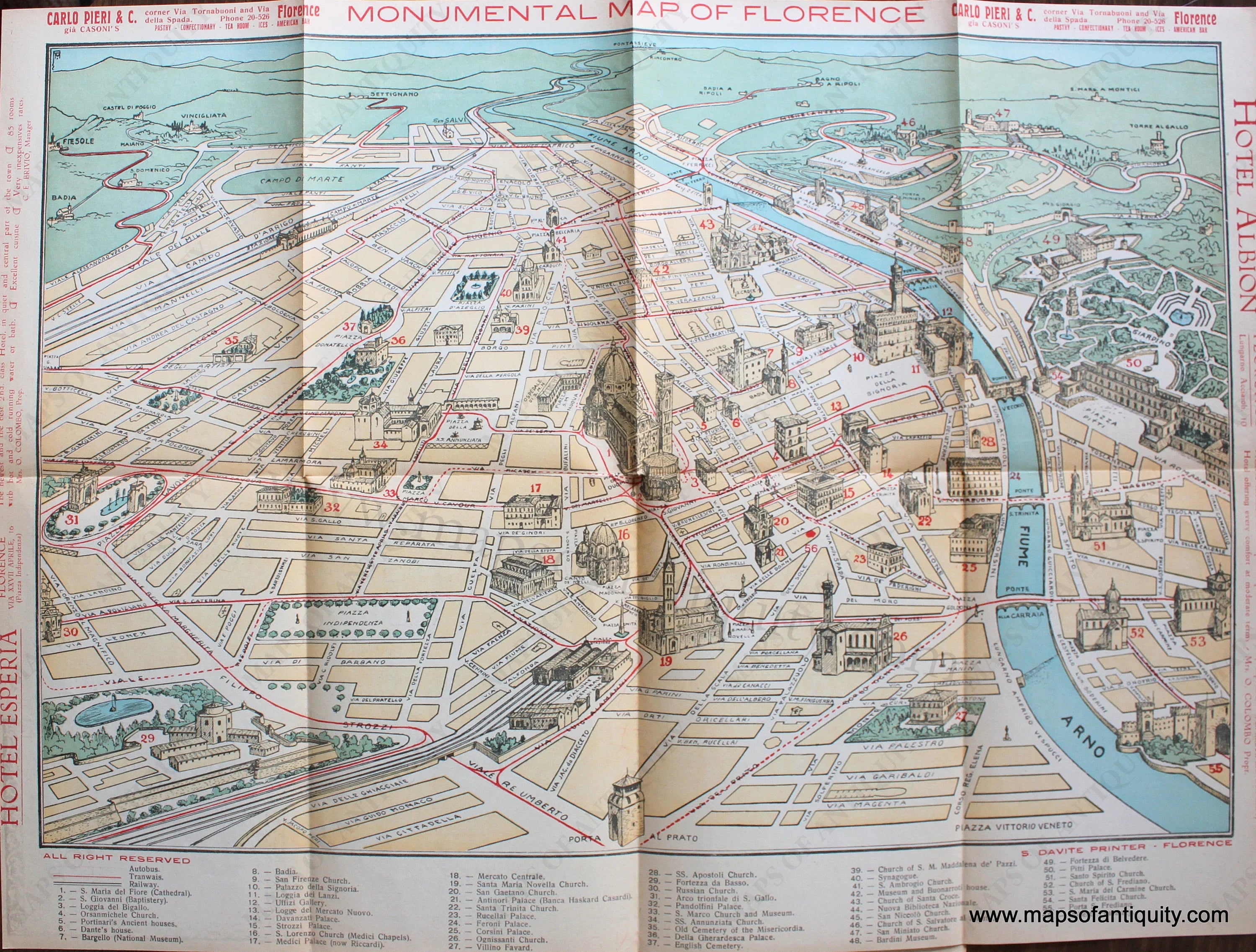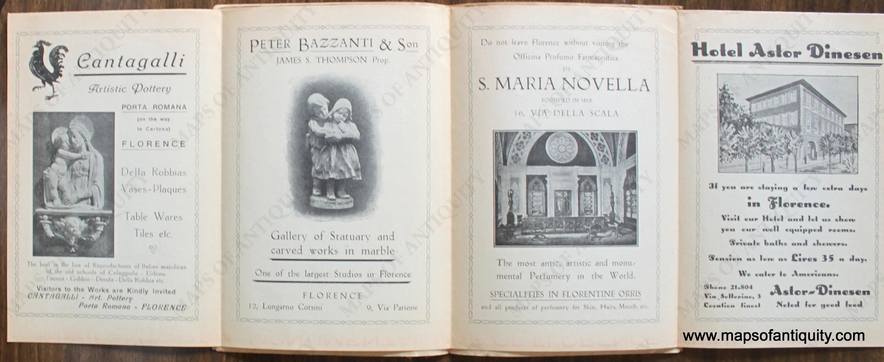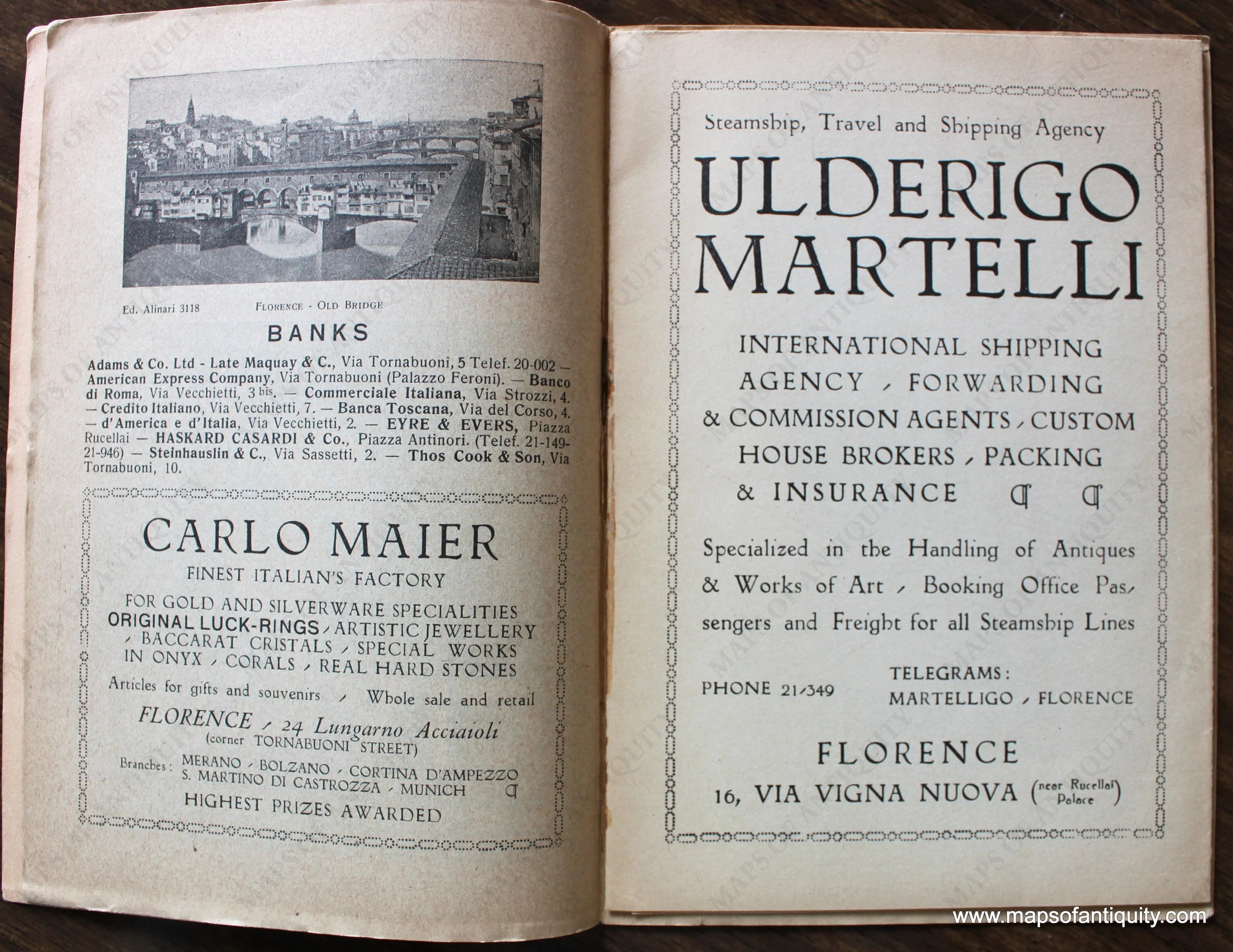 Antique printed color map of Florence, Italy, by S. Davite, 1932. This handsome map features illustrations of notable buildings and monuments, roads, railroads, and tramways. This map is in a booklet titled A Visitor's Map of Florence and Useful Notes for Tourists, Spring 1932. The booklet is filled with advertisements for Florence businesses. Good antique condition with wear along the fold lines and some seam separations. Original paper jacket and booklet is attached. Map measures approx. 14.5 x 19.5 inches to the paper edges.