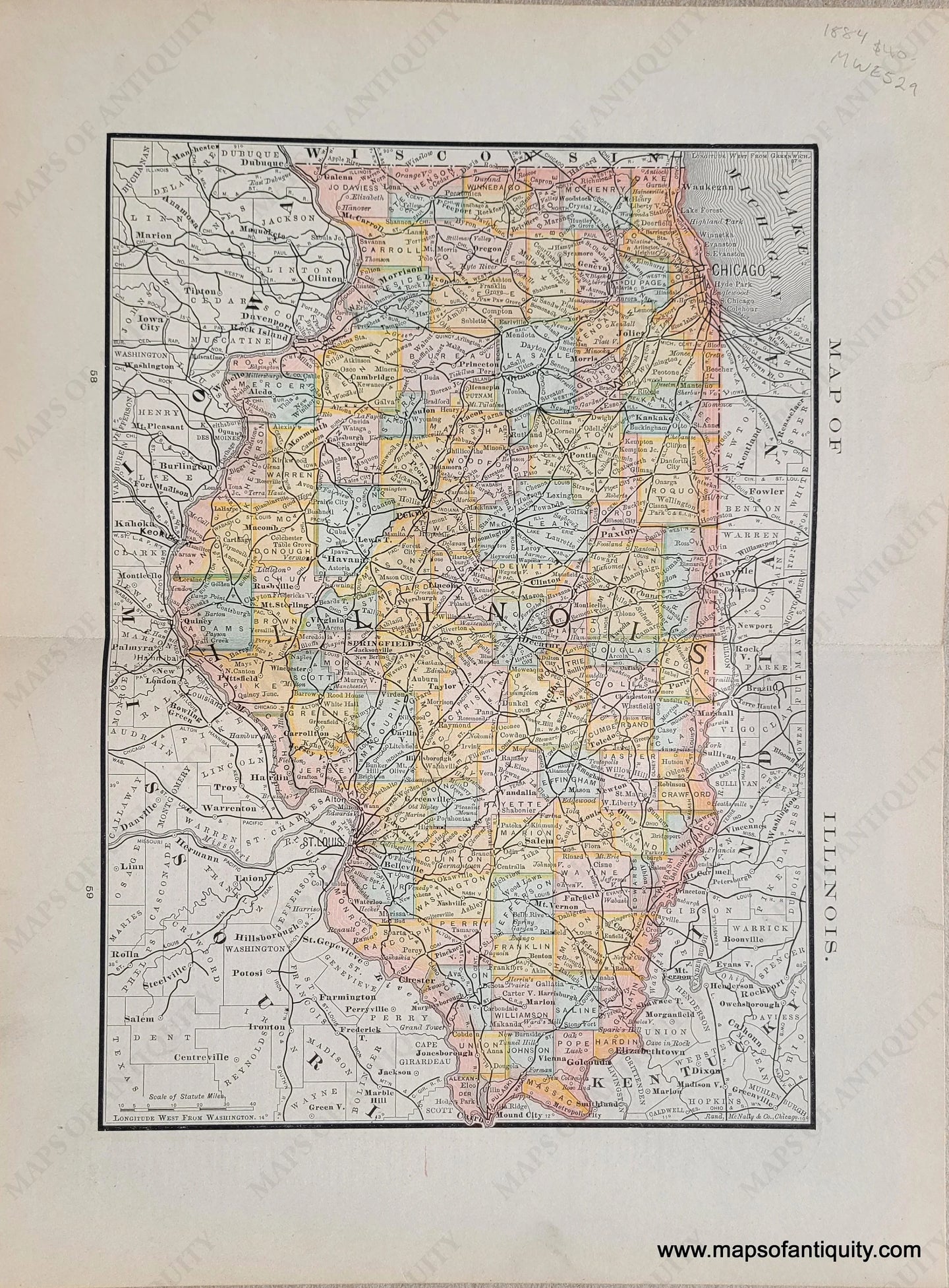 Antique map of Illinois published in Rand, McNally & Co.'s New Dollar Atlas of the United States and Dominion of Canada… 1884, Continental Publishing Co. Shows cities, railroads, colored by county. Very good condition with some tiny spots. Measures approx. 10 x 13 inches to the paper edges.