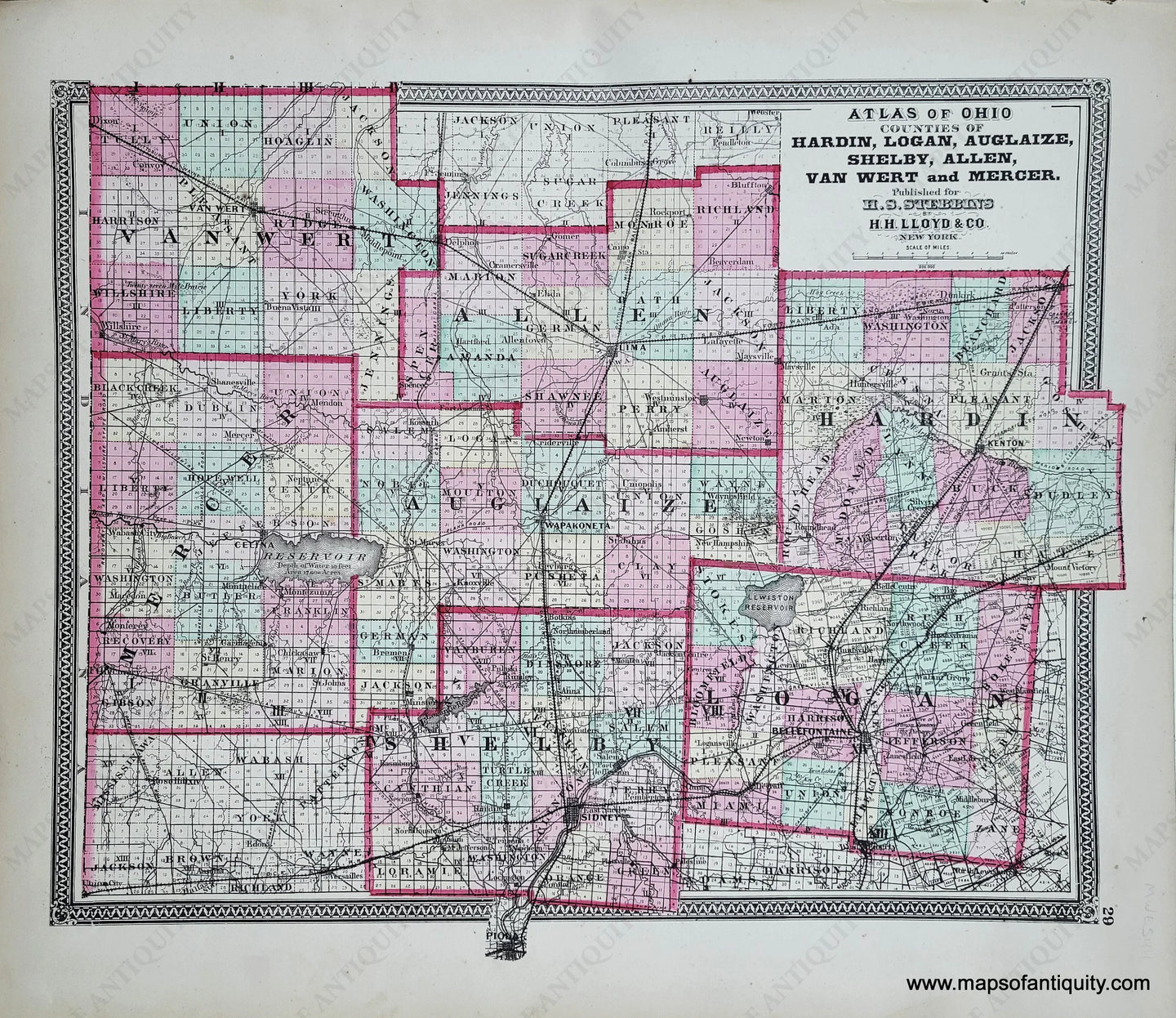 Antique map from the Atlas of the State of Ohio From Surveys under the Direction of H.F. Walling; to which is added an Atlas of the United States, published for Henry S. Stebbins by H.H. Lloyd & Co., 1868. Colored by town, showing railroads, cities, rivers, and more. Good to very good antique condition with some small spots, and some wear at the paper edges. Mild water stain at paper edge. Paper is fragile and should be handled carefully. Measures approx. 12 x 15 inches to the outside of the decorative border. Price is reflective of condition.