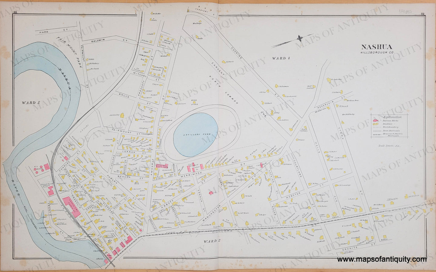 Antique hand colored map of part of the town of Nashua, New Hampshire. From the Town and City Atlas of the State of New Hampshire, by D.H. Hurd, 1892. Includes the names of property owners at the time of publication. Center fold, as issued. Good antique condition with some toning of the paper and areas of foxing/soiling, which are most prevalent outside the neatline. Measures approx. 26.25 x 16 inches.